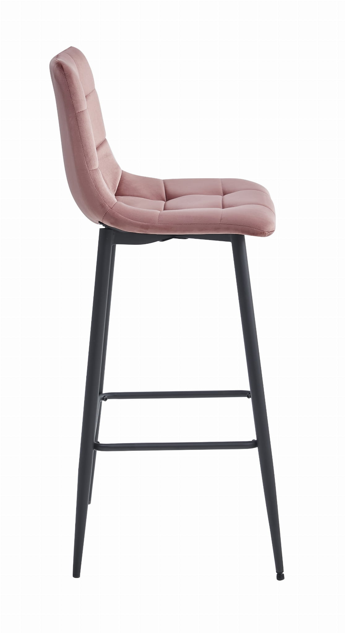 Siedzisko na wysokości 76 cm dedykowane jest do wysokich blatów. Czarna, metalowa konstrukcja kontrastuje z delikatnym kolorem tapicerki, tworząc nowoczesną całość. Welur jest miękki i pięknie pracuje ze światłem.