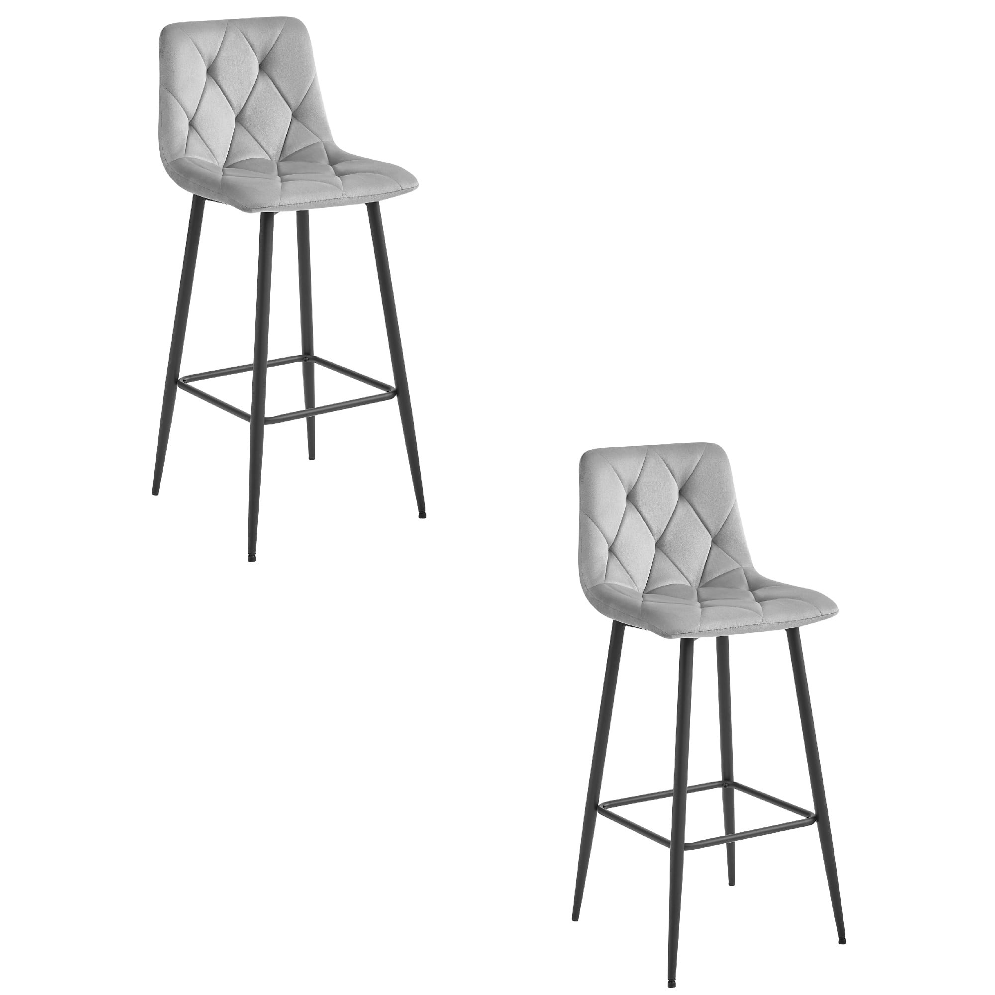 Komplet 2 wysokich hokerów (76 cm). Srebrno-szary welur, czarne nogi. Nowoczesny design. Idealne do wysokiego barku.