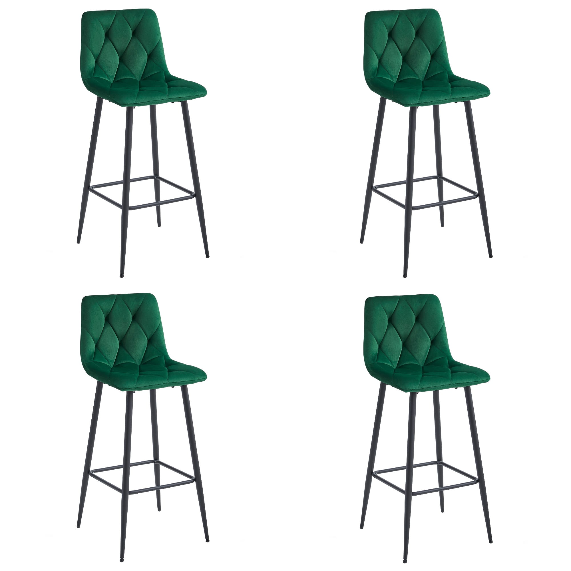 Duży zestaw 4 hokerów barowych zielonych. Welur, czarne nogi. Wysokie siedzisko (76 cm) do baru. Wytrzymałe i stabilne.