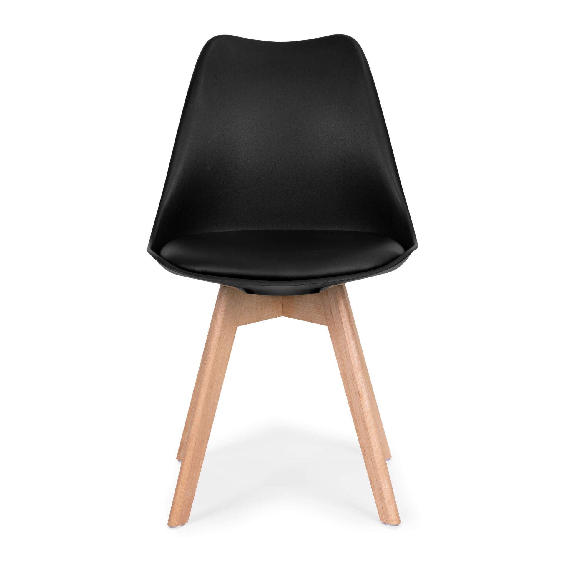 Zestaw 4 krzeseł skandynawskich z poduszką z ekoskóry. Nogi z drewna bukowego, czarne wyprofilowane siedzisko i udźwig do 120 kg. Idealne do nowoczesnego salonu, jadalni oraz biura.
