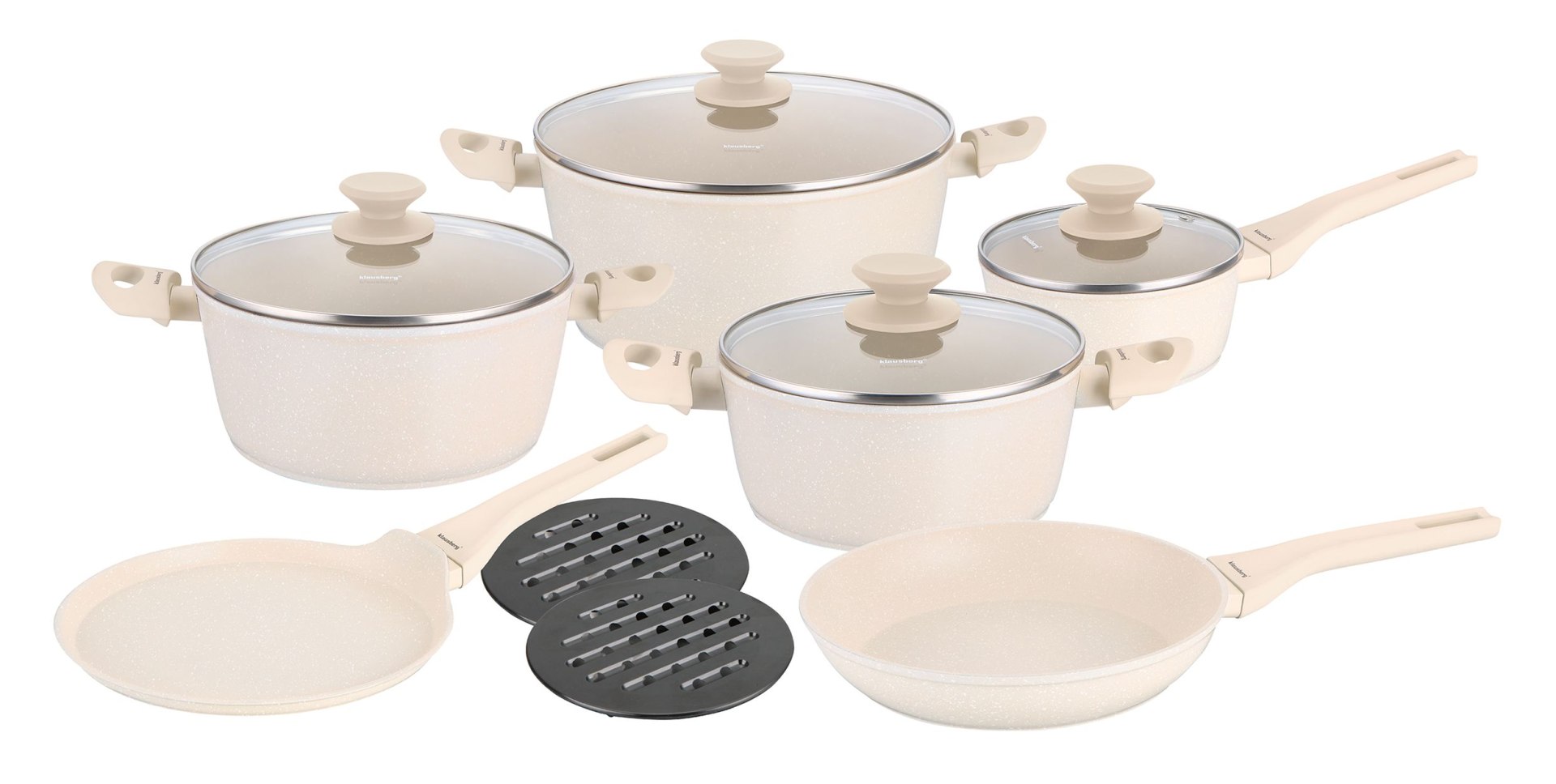 Duży zestaw garnków marmurowych 12 elementów. Zawiera patelnię do naleśników i rondel. Powłoka non-stick, na indukcję. Kompletne wyposażenie. Marka Klausberg.