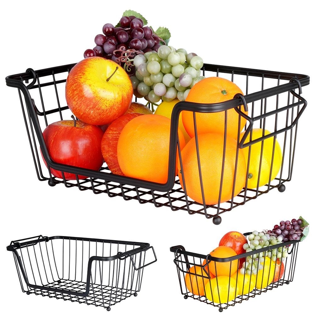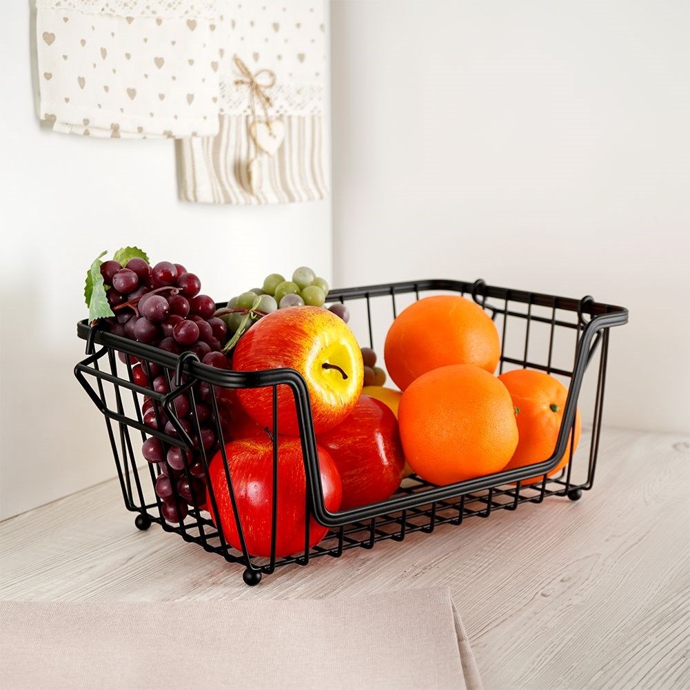 Metalowy koszyk na owoce i warzywa w stylu loft. Czarny, prostokątny, z możliwością piętrowania. Idealny do organizacji kuchni. Marka Vilde.