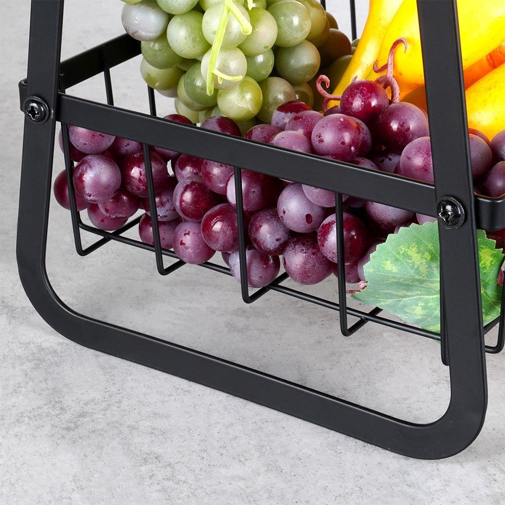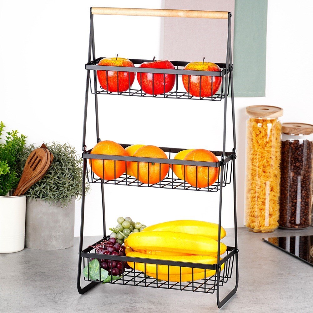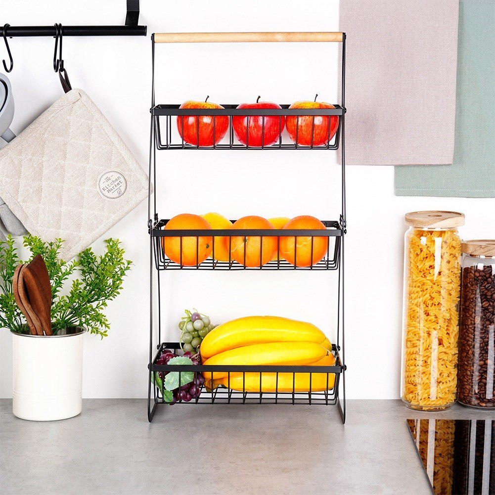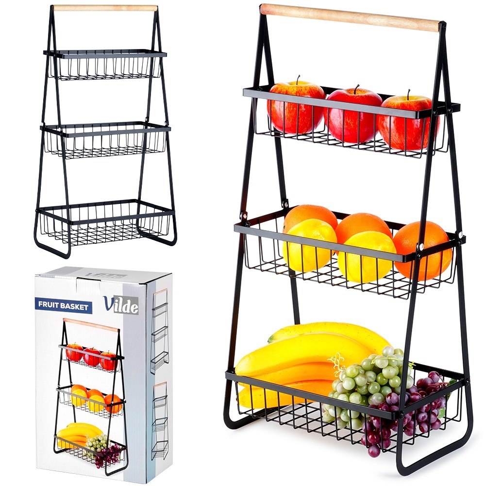 3-poziomowy stojak na owoce z metalowymi koszykami. Kolor czarny, drewniany uchwyt. Styl loft. Duża pojemność, oszczędność miejsca. Marka Vilde.