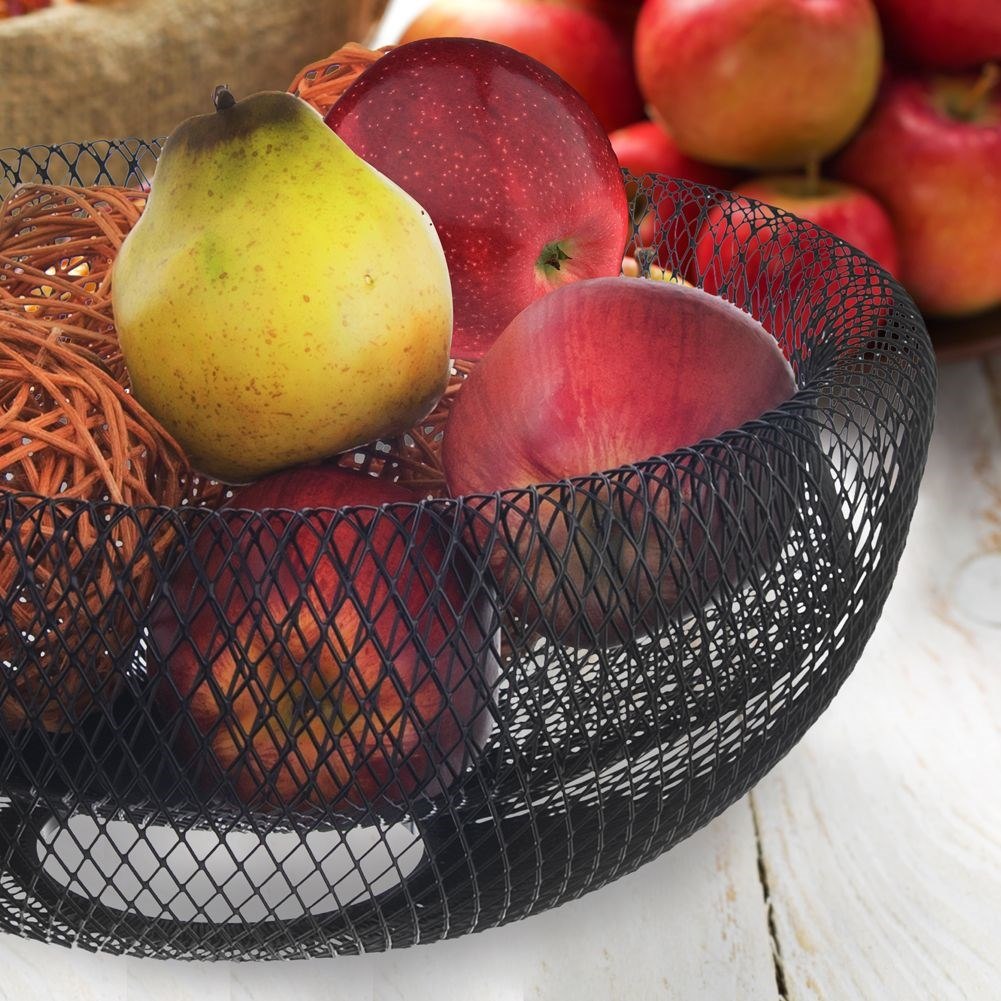 Wybierz koszyk, który przyciąga wzrok! Metalowa misa na owoce Orion Radka o średnicy 30 cm wyróżnia się unikalną konstrukcją z podwójnymi ściankami z cienkich drucików, co tworzy ciekawy efekt wizualny. Czarny, matowy kolor i nowoczesna forma sprawiają, że koszyk wygląda jak designerska rzeźba. Idealny do przechowywania owoców, warzyw, a także jako elegancki pojemnik na drobiazgi w salonie.