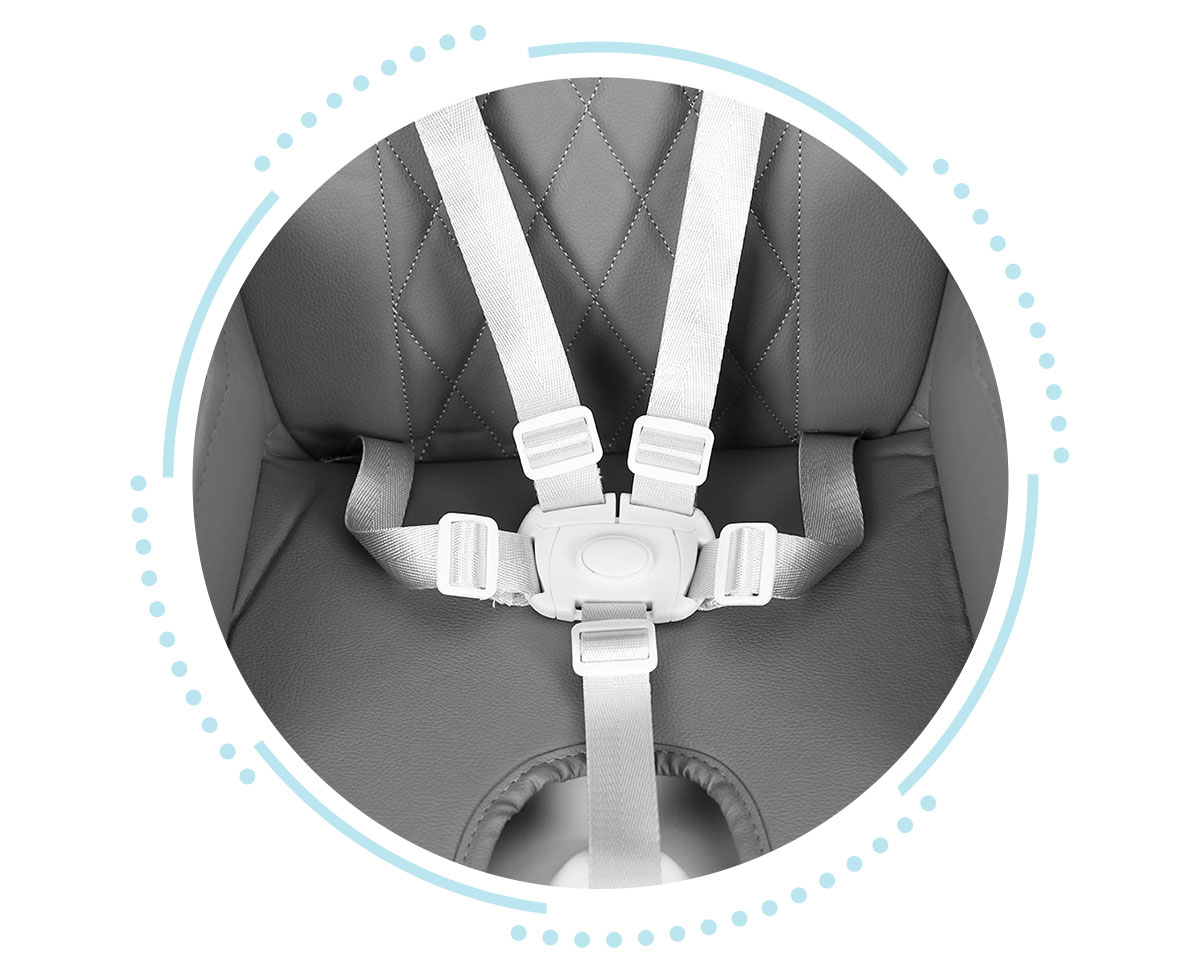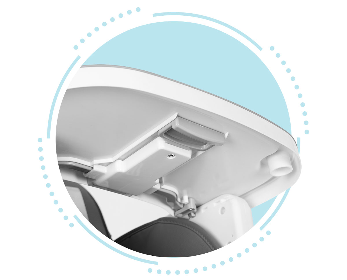 - Regulowana dwuwarstwowa tacka: Możliwość dostosowania odległości od oparcia oraz łatwe mycie dzięki zdejmowanej nakładce.