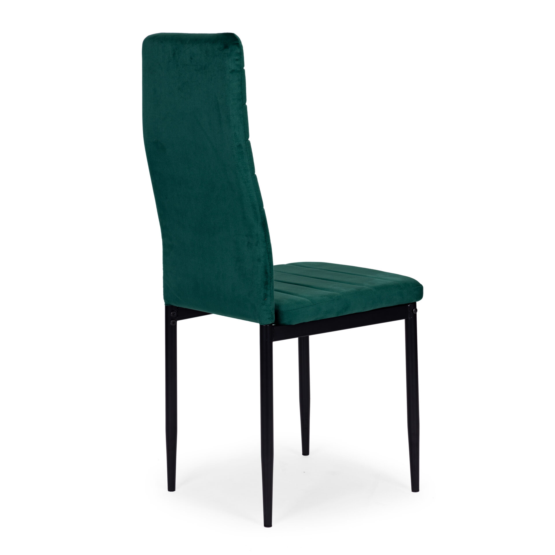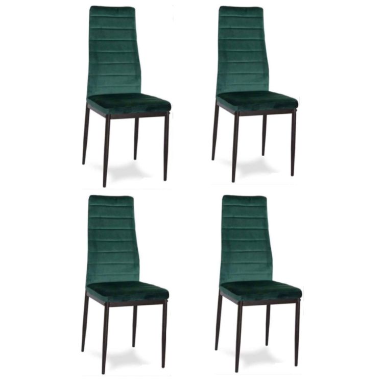 Zestaw 4 zielonych krzeseł welurowych (butelkowa zieleń). Pikowane oparcie, pianka PU i czarne stalowe nogi. Wysoki komfort i stabilność do 120 kg. Elegancja od ModernHome.