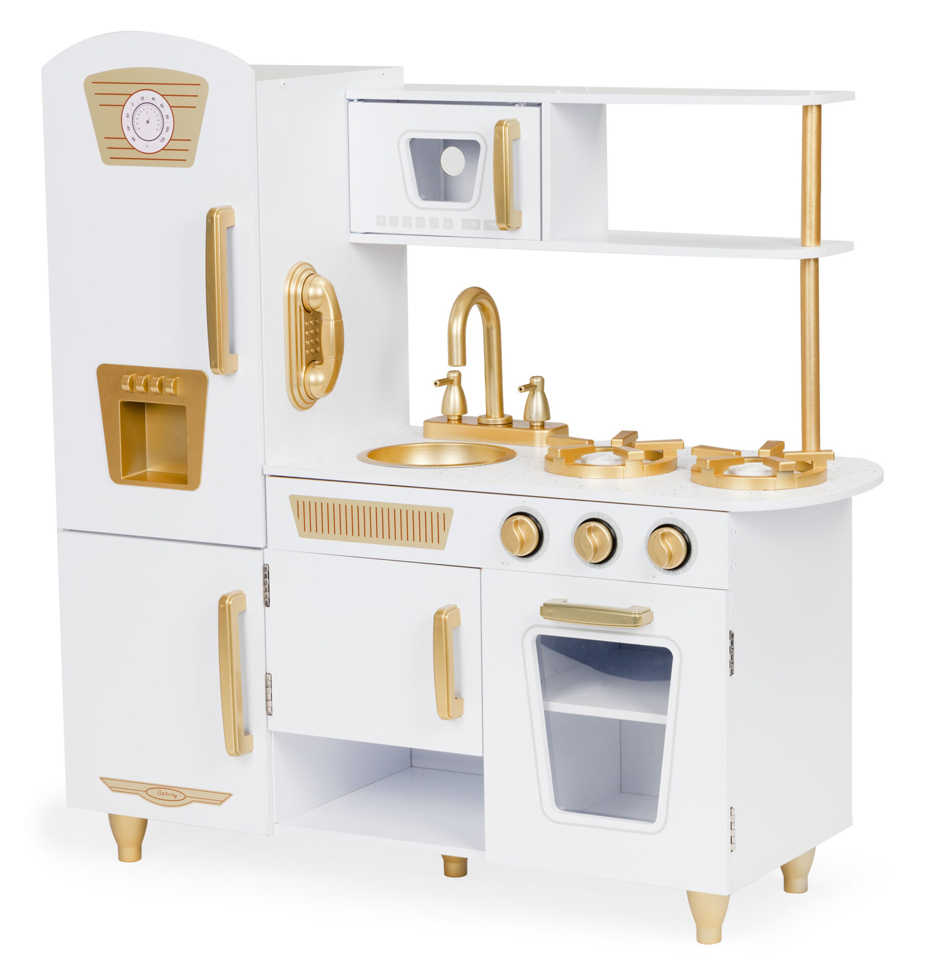 Luksusowa drewniana kuchnia biało-złota XXL. Wyposażona w lodówkę z dozownikiem lodu, piekarnik, mikrofalę i telefon. Stabilna konstrukcja, klikające pokrętła i elegancki design. Bezpieczna zabawa dla dzieci 3+.