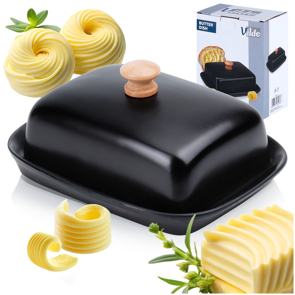 Wprowadź elegancję do swojej jadalni dzięki ceramicznej maselniczce Vilde, która łączy nowoczesny, czarny mat z naturalnym drewnem.