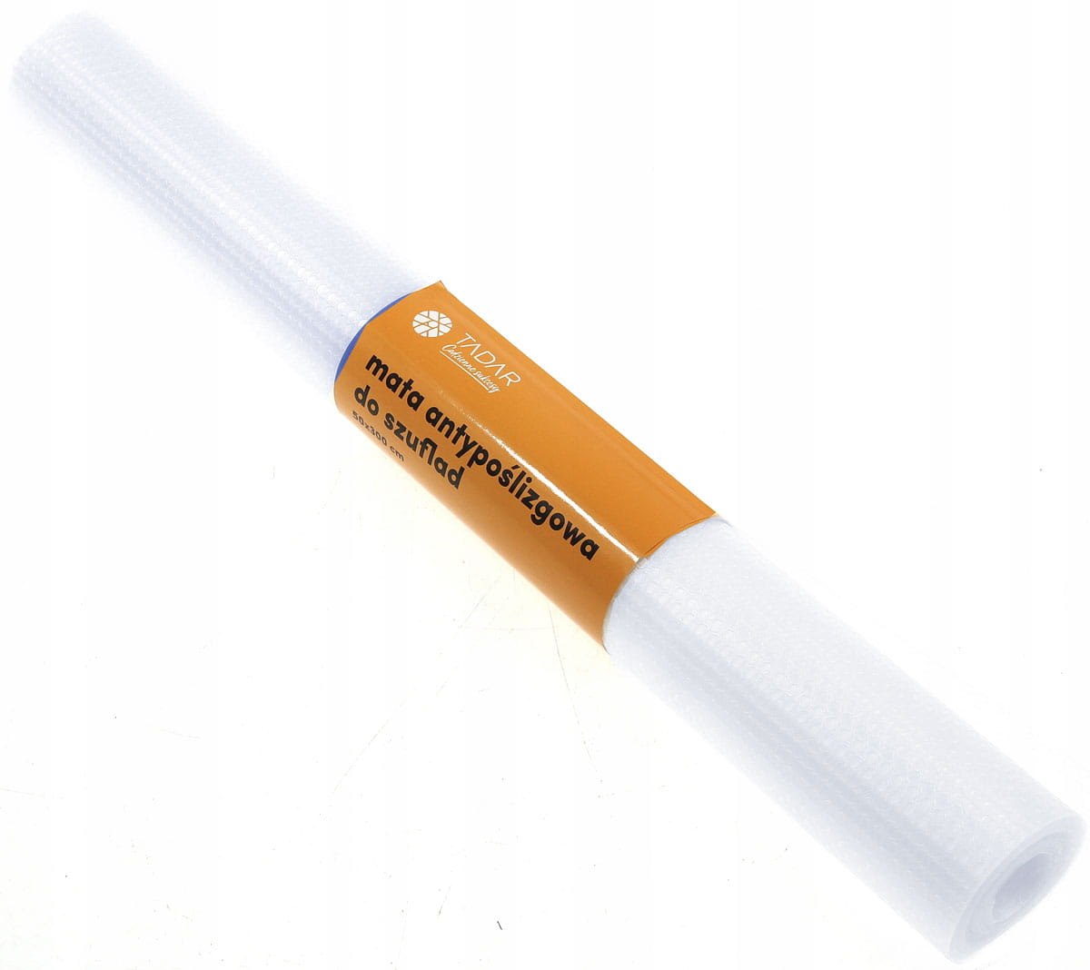 Duża rolka maty antypoślizgowej (300×50 cm). Przezroczysta, do przycięcia. Chroni dno szuflad i szafek. Zapobiega przesuwaniu. Marka Tadar.