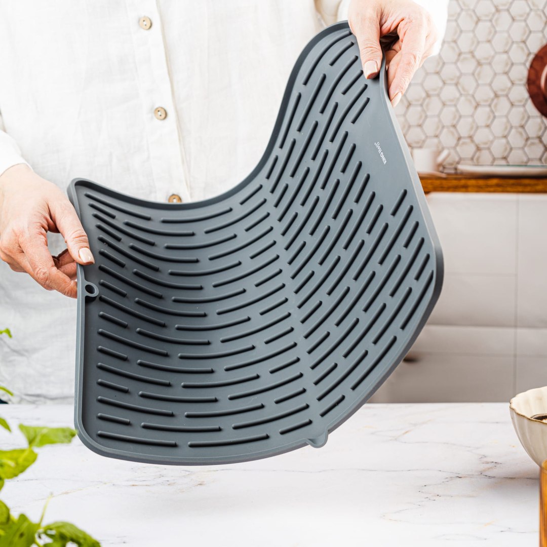 Szara mata silikonowa do suszenia naczyń. Wymiary 42×33 cm. Zwijana, łatwa w przechowywaniu. Może służyć jako podkładka pod gorące. Marka Kinghoff.
