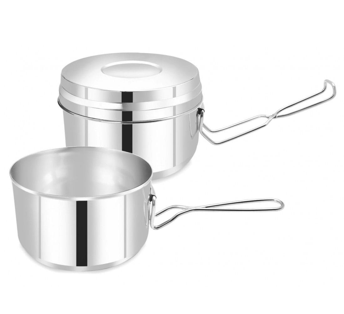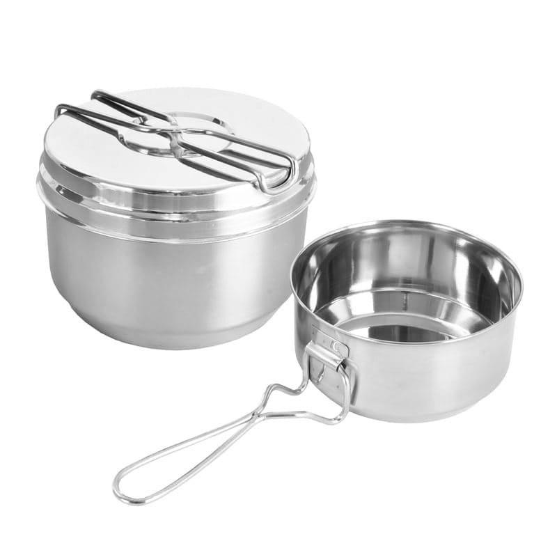 Stalowa menażka turystyczna 3-częściowa. Składane uchwyty. Garnek 1.5L, rondel 0.9L i talerz. Idealna na obozy i kemping. Marka Kinghoff.