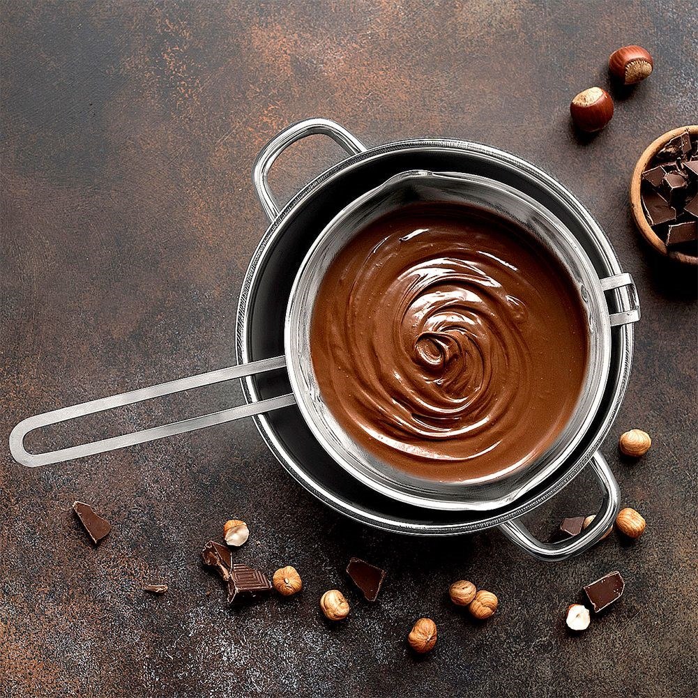 Duża miska do kąpieli wodnej (1.2L). Stal nierdzewna. Długa rączka, dwa dzióbki. Idealna do dużej ilości czekolady lub wosku. Marka Orion.