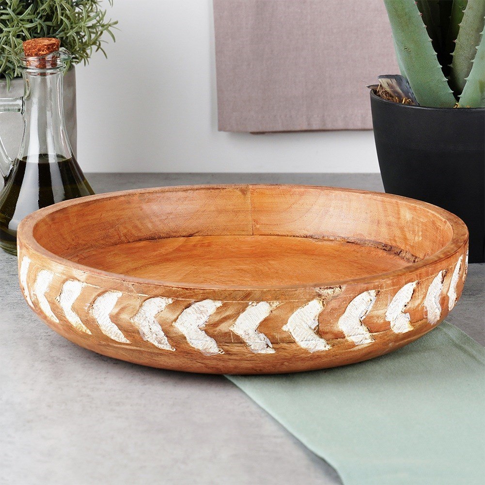 Duża miska z drewna mango z rzeźbionym wzorem. Średnica 30,5 cm, 2,5 L. Styl boho/etno. Idealna na owoce i sałatki. Marka Vilde.