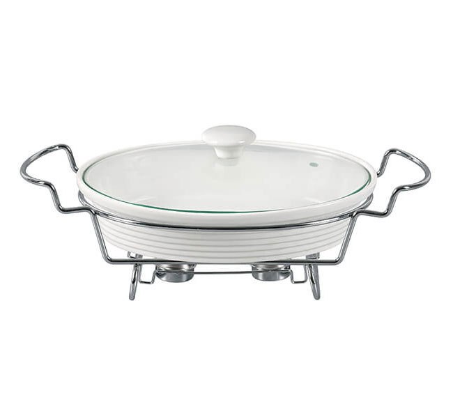 Elegancja i wygoda na Twoim stole. Duże naczynie żaroodporne Maestro o pojemności 2,2 L to rozwiązanie na większe przyjęcia. Zestaw składa się ze szklanej formy (odpornej na wysokie temperatury), szklanej pokrywy oraz stabilnego stelaża z miejscem na podgrzewacze (świeczki). Dzięki temu zapiekanki, mięsa czy gołąbki pozostają gorące i apetyczne przez całą kolację. Chromowany stojak z uchwytami ułatwia bezpieczne przenoszenie gorącego naczynia.