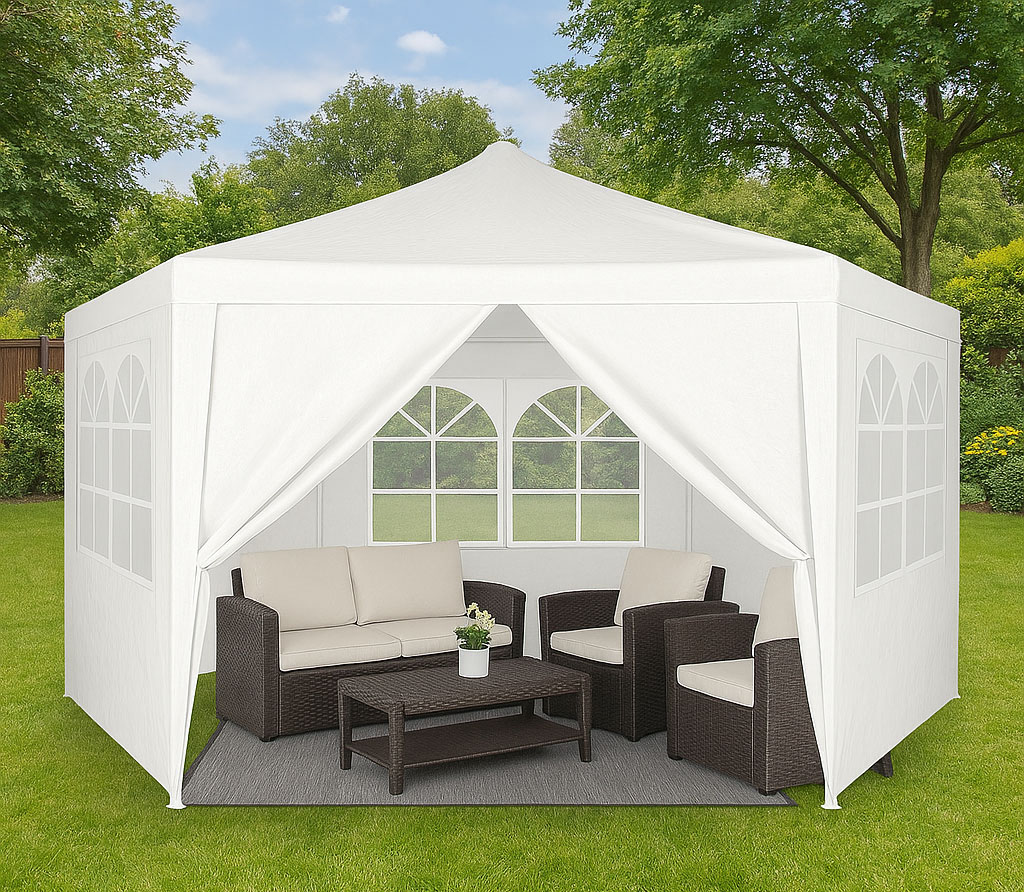 Postaw na jasne i nowoczesne zadaszenie swojego tarasu lub stoiska handlowego. Biały pawilon od MultiGarden to synonim funkcjonalności – wyposażony w 6 ścianek (5 z oknami, 1 z zamkiem) zapewnia jasne i przewiewne wnętrze, chroniąc jednocześnie przed owadami i słońcem. Lekka, ale usztywniona stalowa konstrukcja pozwala na szybki montaż, czyniąc go idealnym rozwiązaniem na rodzinne obiady pod chmurką.