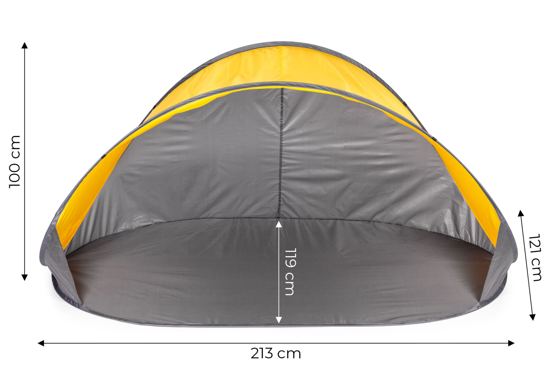 Samorozkładający namiot plażowy pop-up z ochroną UV. Wykonany z poliestru 190T, stelaż z włókna szklanego 5,5 mm. W zestawie śledzie, linki i torba transportowa. Idealny na plażę i do ogrodu od MultiGarden.