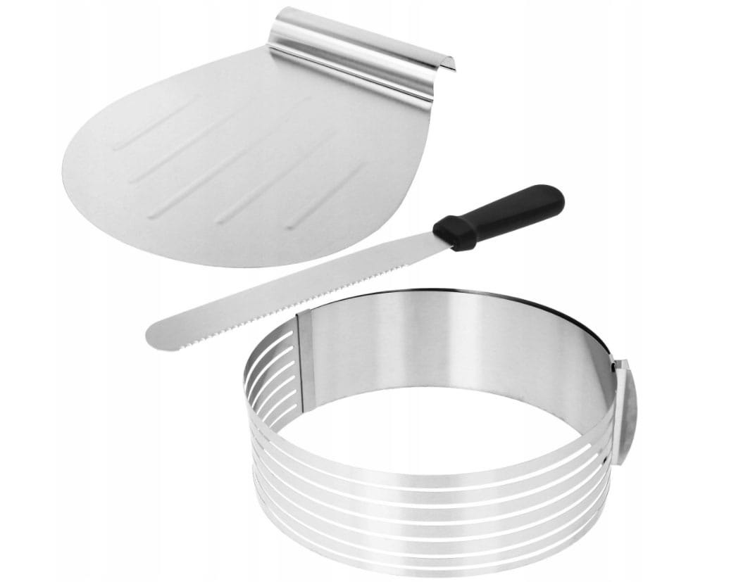 Zestaw do krojenia tortów: regulowana obręcz, długi nóż i łopatka. Kroi biszkopt na 7 równych warstw. Stal nierdzewna. Marka Brunbeste.
