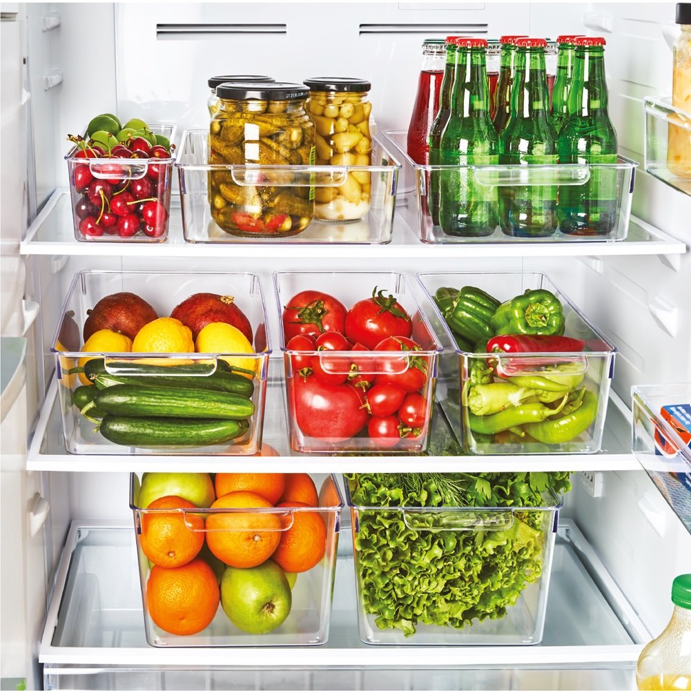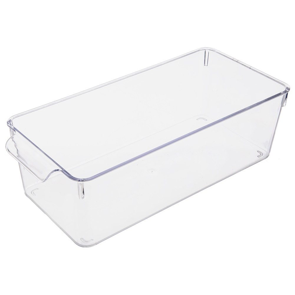 Uniwersalny pojemnik do lodówki. Wymiary 32,5x15x10 cm. Przezroczysty, wysoki. Idealny na owoce i nabiał. Marka Orion.