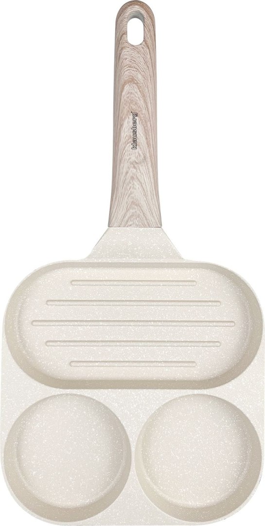 Beżowa patelnia dzielona 3w1 do śniadań. Sekcja na jajka i grill. Powłoka marmurowa, uchwyt drewnopodobny. Na indukcję. Marka Klausberg.