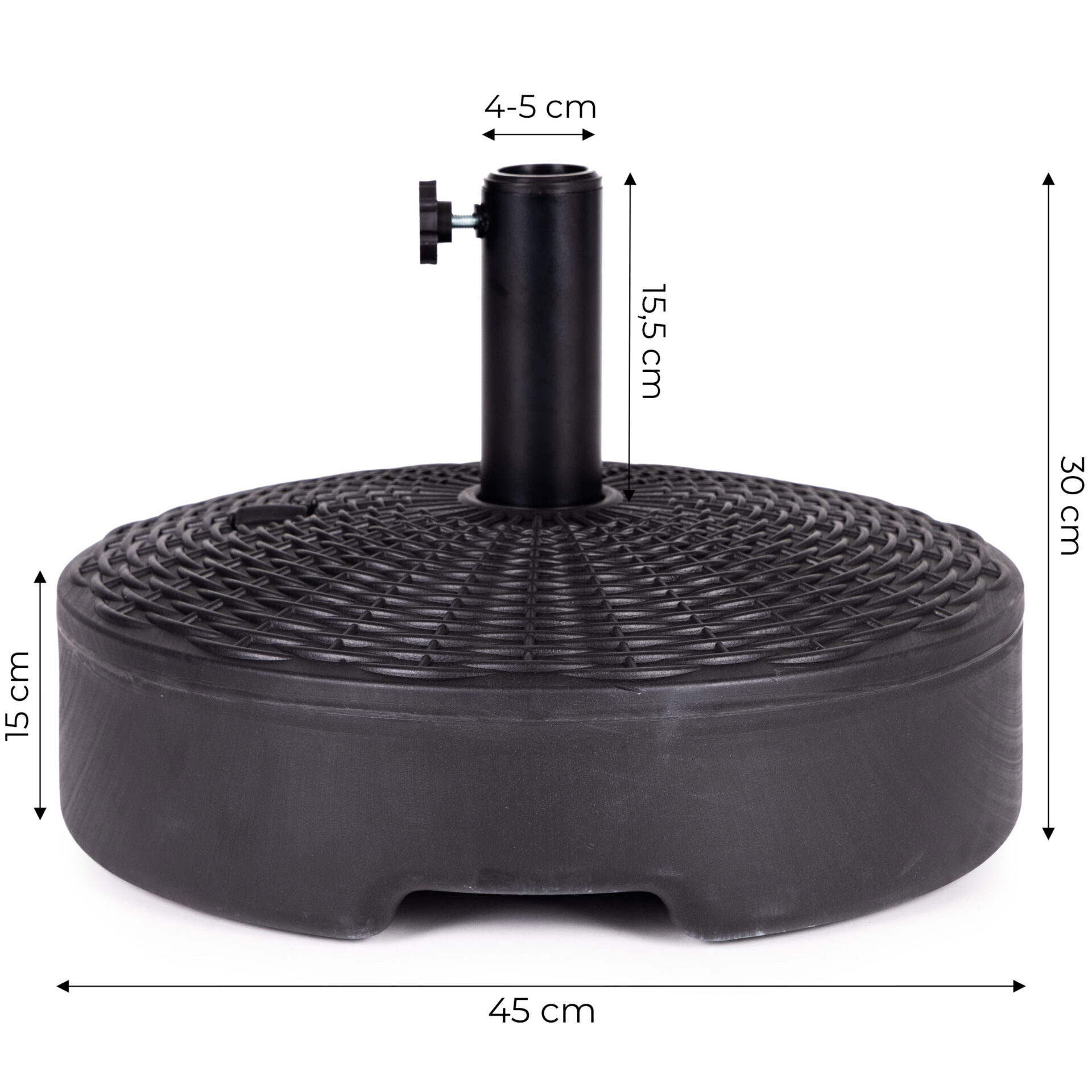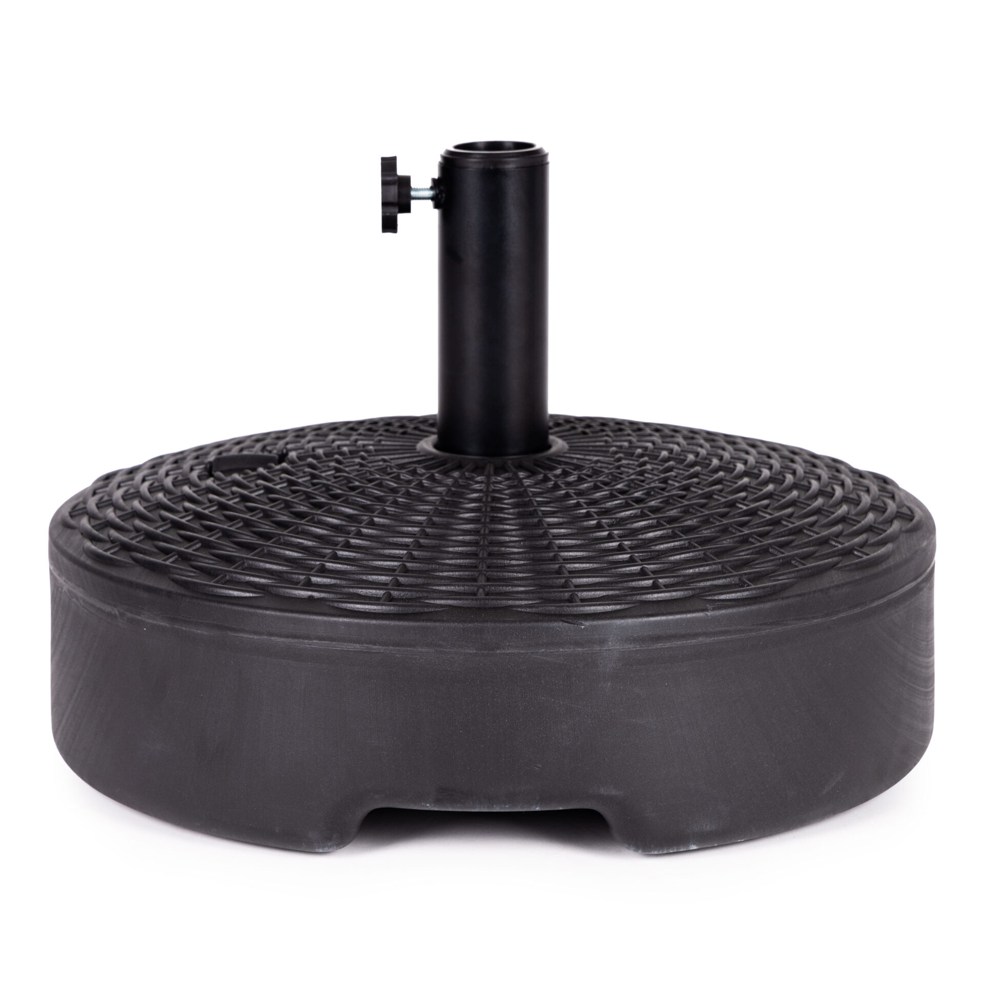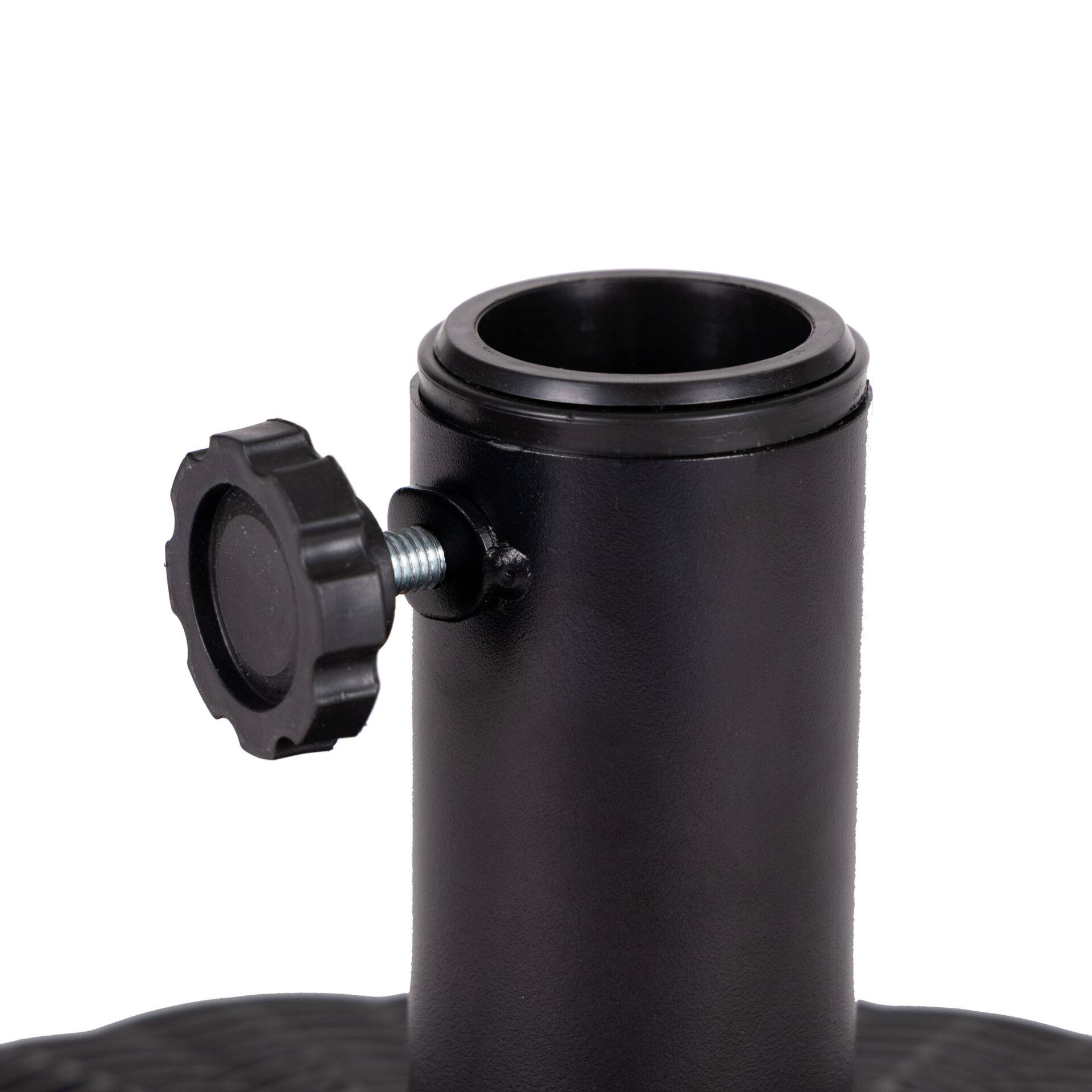 Okrągła podstawa pod parasol napełniana wodą (22L). Wykonana z trwałego HDPE, metalowy trzpień z pierścieniami 4/5 cm i śrubą dociskową. Zapewnia stabilność mniejszym parasolom ogrodowym.