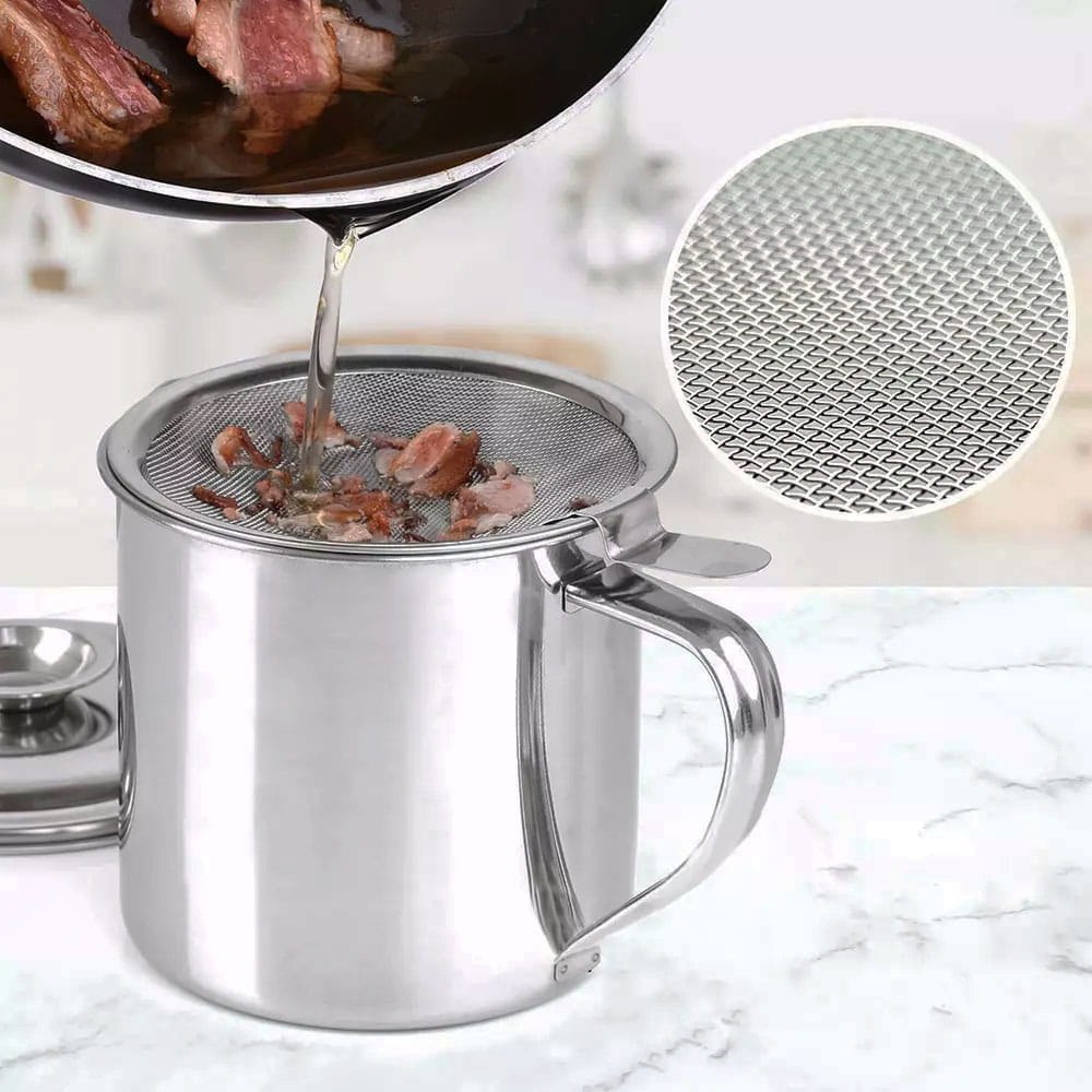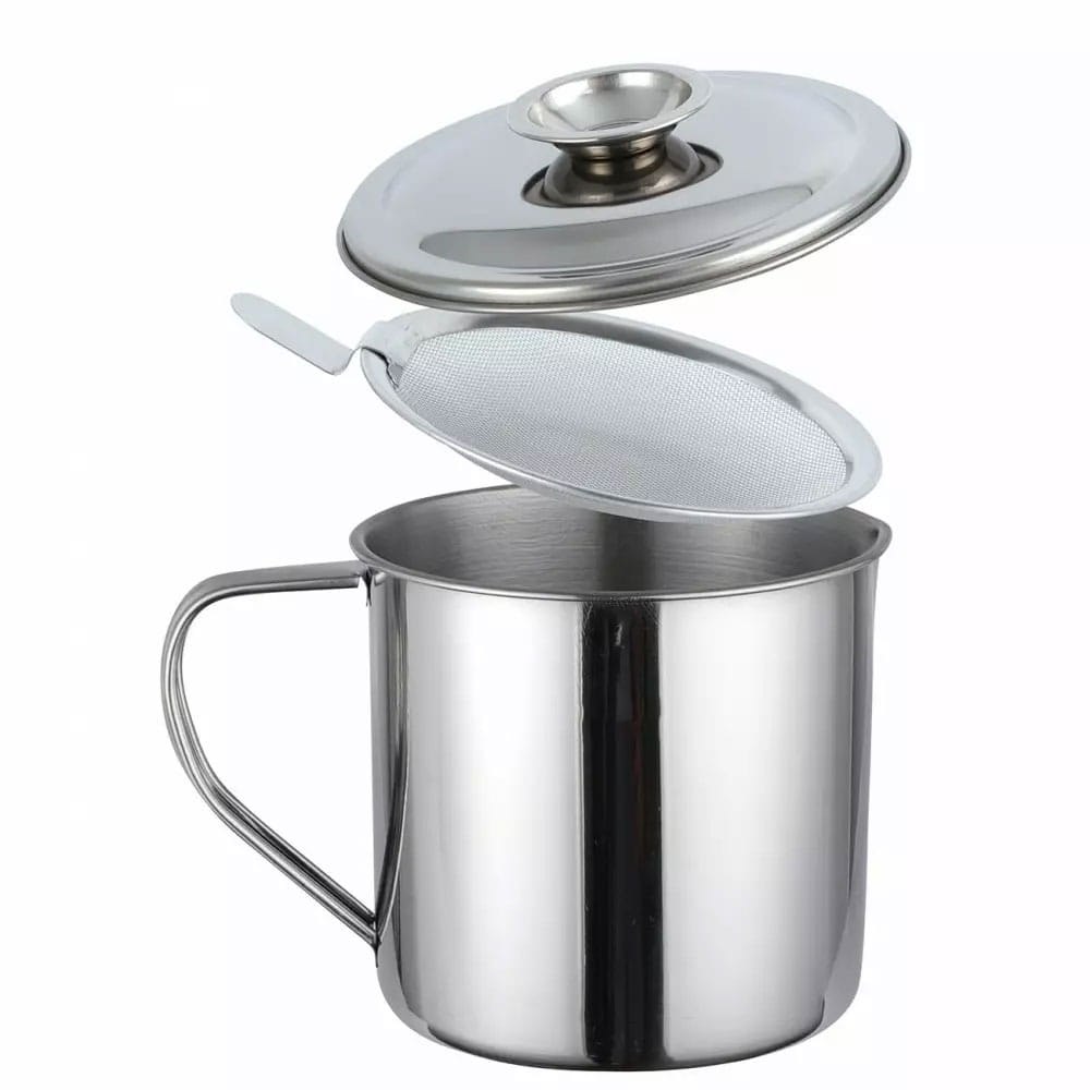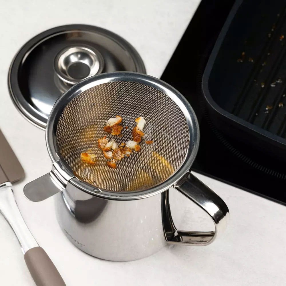 Stalowy pojemnik na olej z sitkiem filtrującym. Pojemność 1,2L. Pozwala oczyścić i przechować olej po smażeniu. Oszczędny i ekologiczny. Marka Kinghoff.