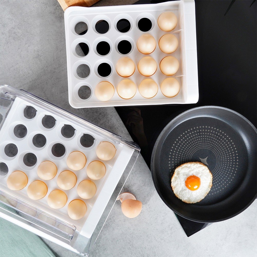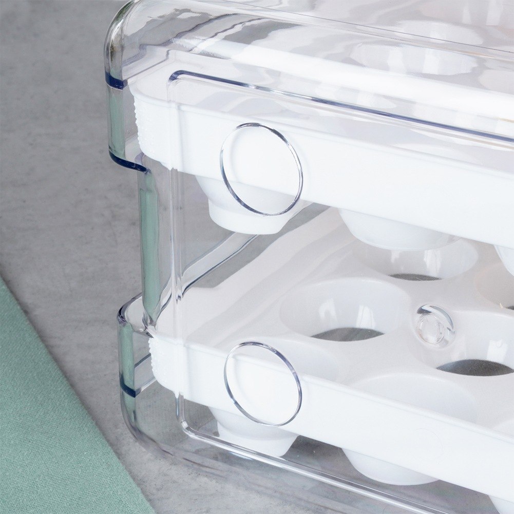 Dwupoziomowy pojemnik na 40 jajek z szufladami. Oszczędność miejsca i łatwy dostęp. Solidna konstrukcja chroniąca jajka. Marka Vilde.