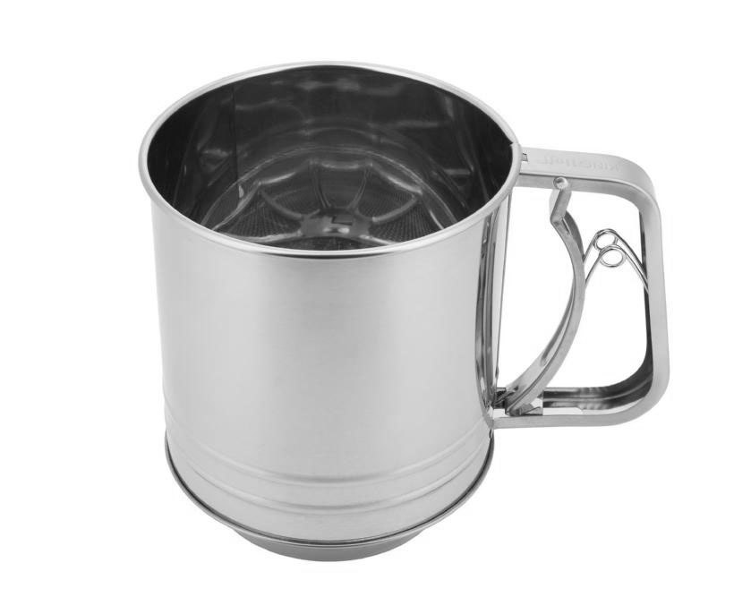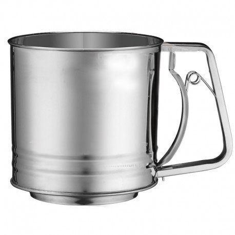 Duży przesiewacz do mąki 450g ze stali nierdzewnej. Wygodny uchwyt sprężynowy. Do mąki, kakao i cukru. Marka Kinghoff.