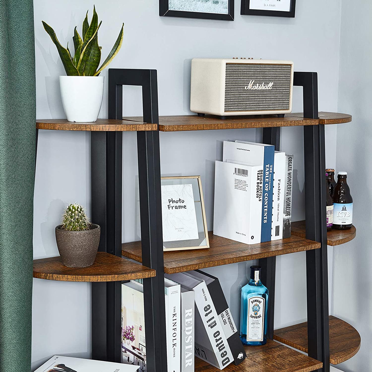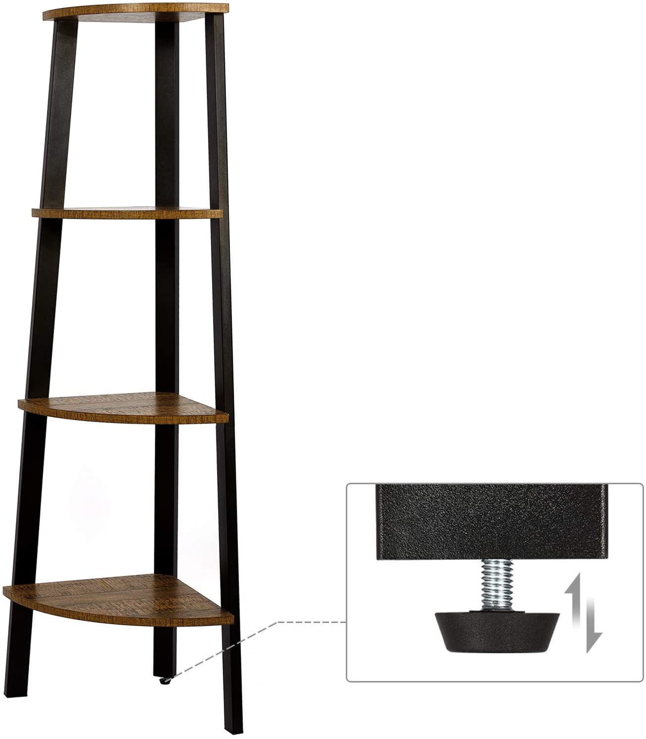 Połączenie płyty wiórowej w kolorze rustykalnego brązu z czarną, metalową ramą tworzy modny mebel w stylu loft. Regał jest stabilny (regulowana nóżka) i bezpieczny (zabezpieczenie przed przewróceniem).