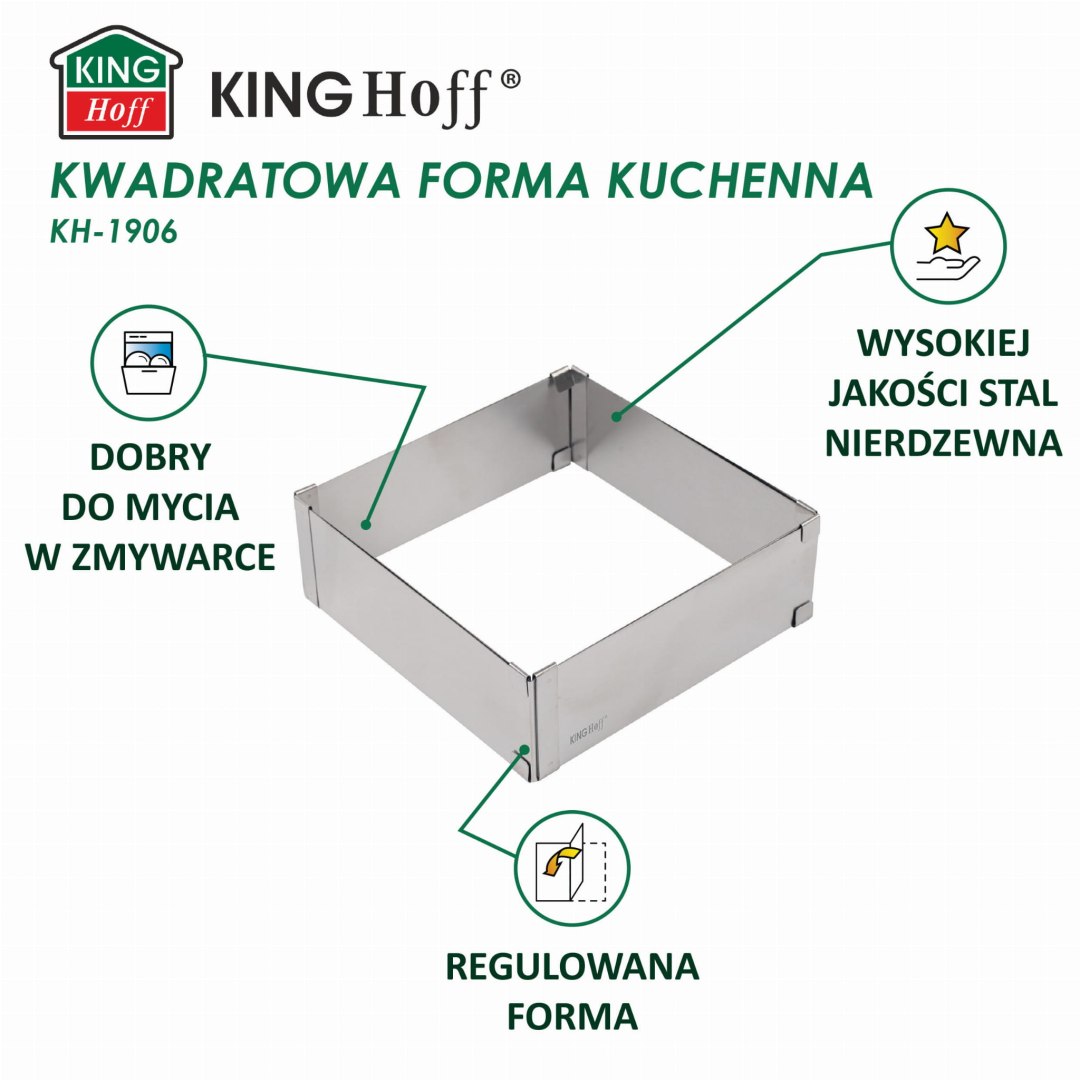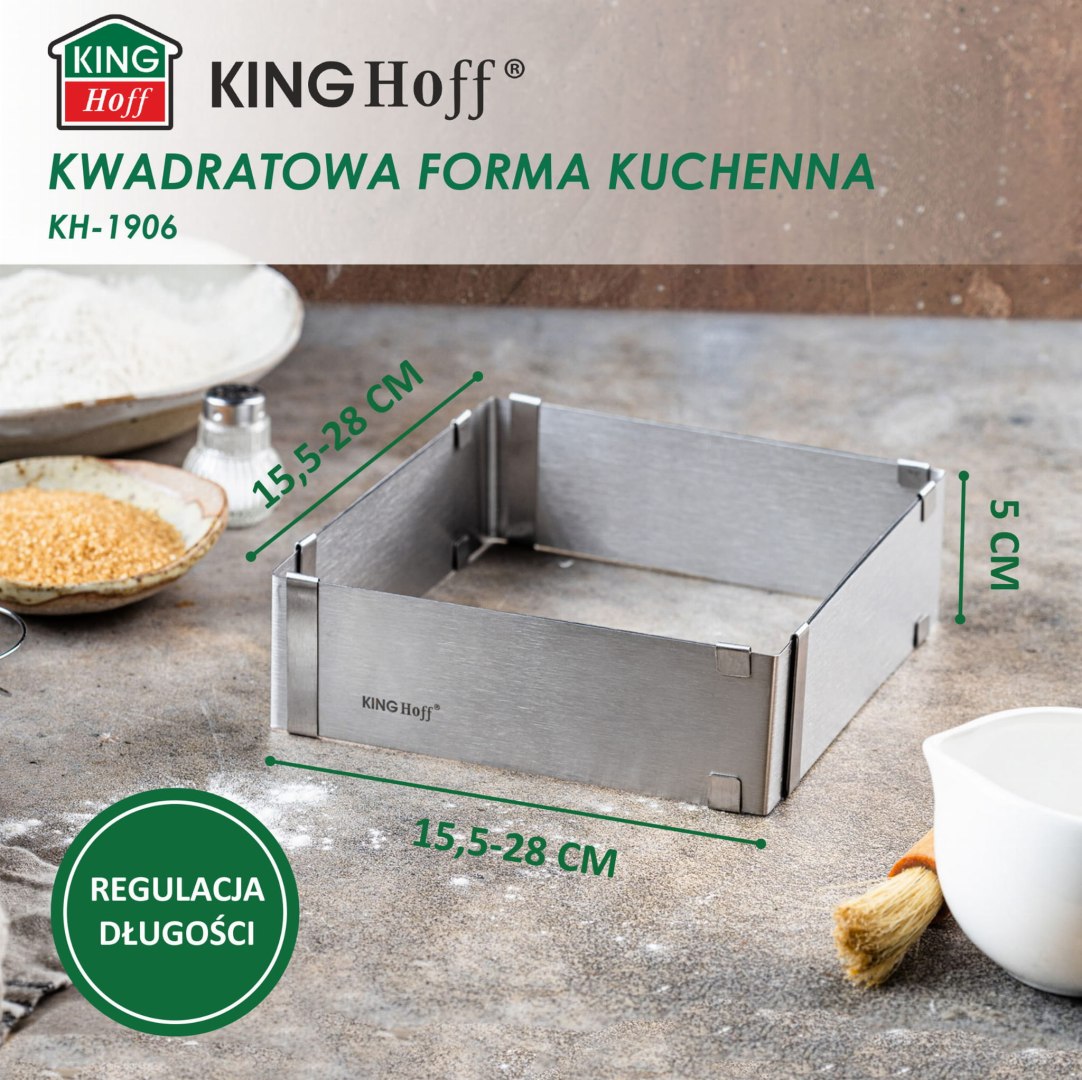 Prostokątny, regulowany rant cukierniczy (15-28 cm). Wysokość 5 cm. Stal nierdzewna. Idealny do pieczenia i składania ciast. Marka Kinghoff.