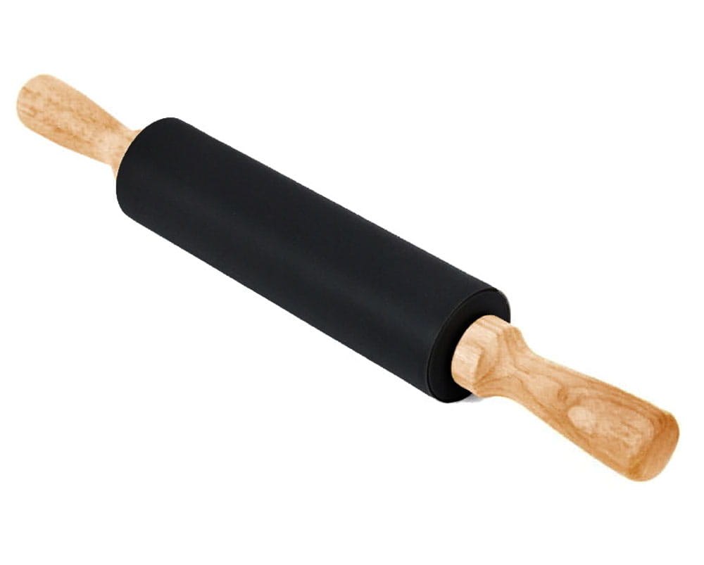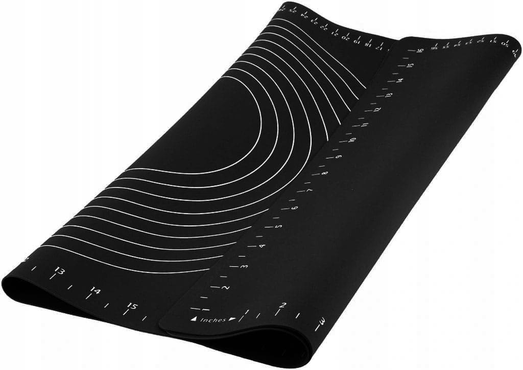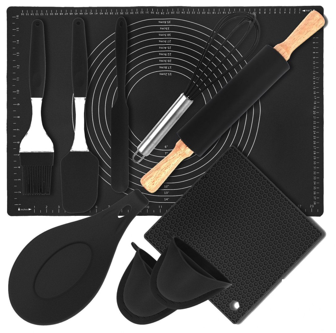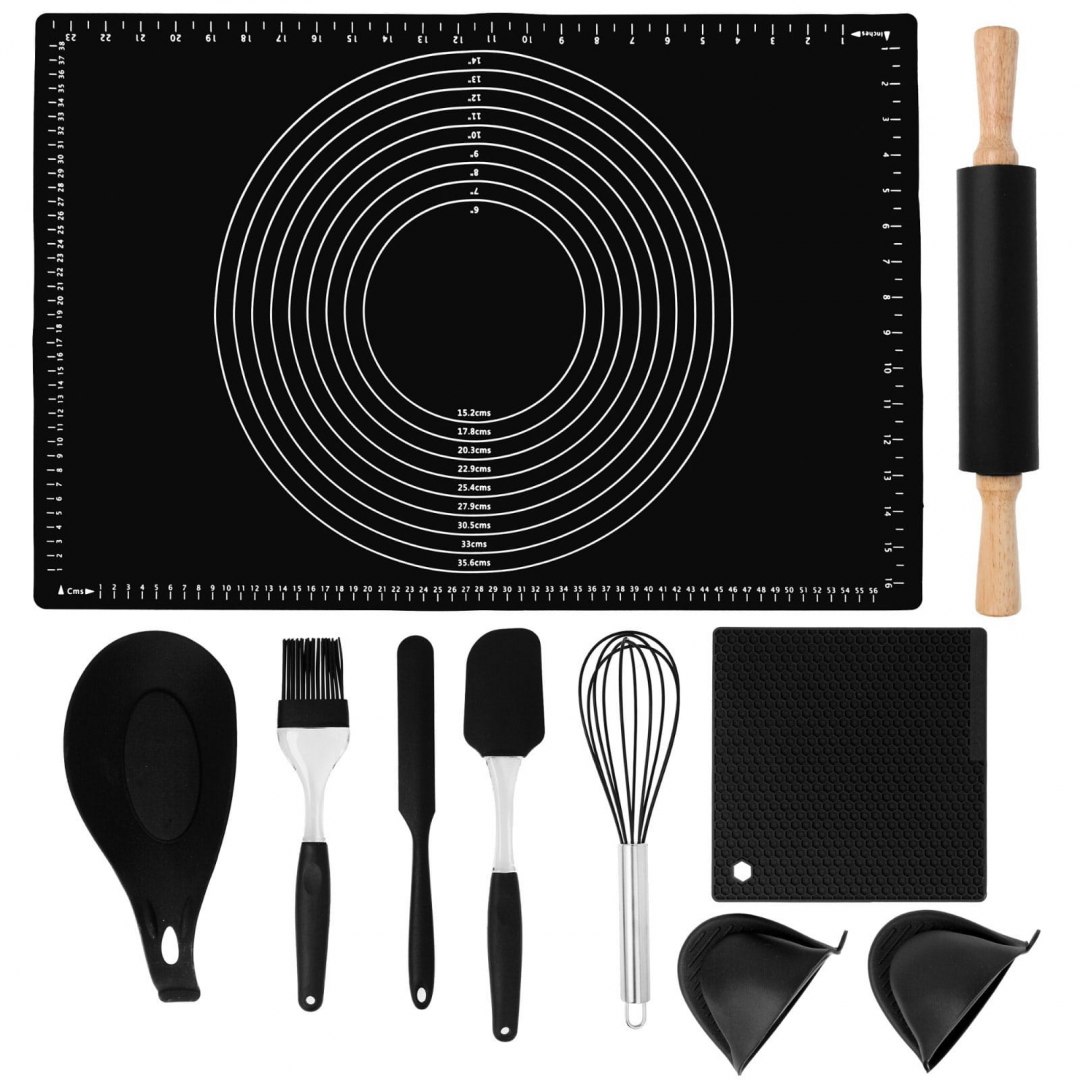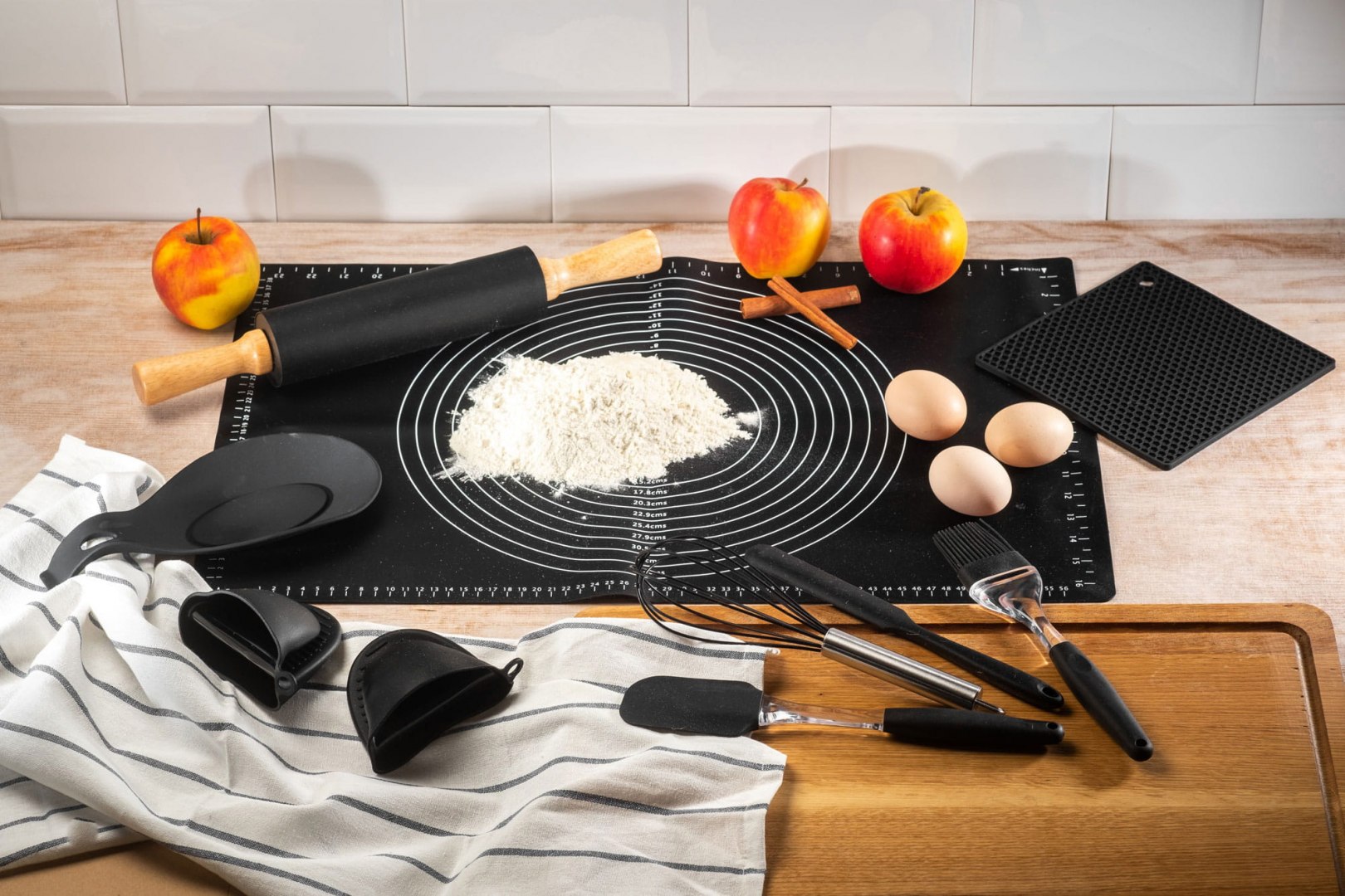 Duży zestaw do pieczenia 10 elementów. Stolnica silikonowa 60×40 cm, wałek, przybory kuchenne. Kolor czarny. Marka Brunbeste.