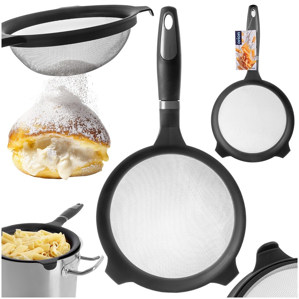 Duże sitko kuchenne 19,5 cm z rączką. Drobna siatka stalowa. Do mąki, cukru pudru i odcedzania. Marka Orion.