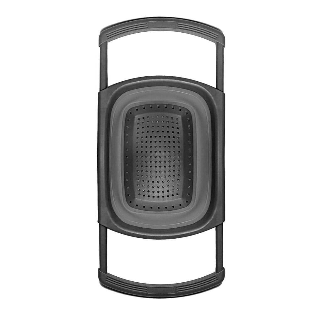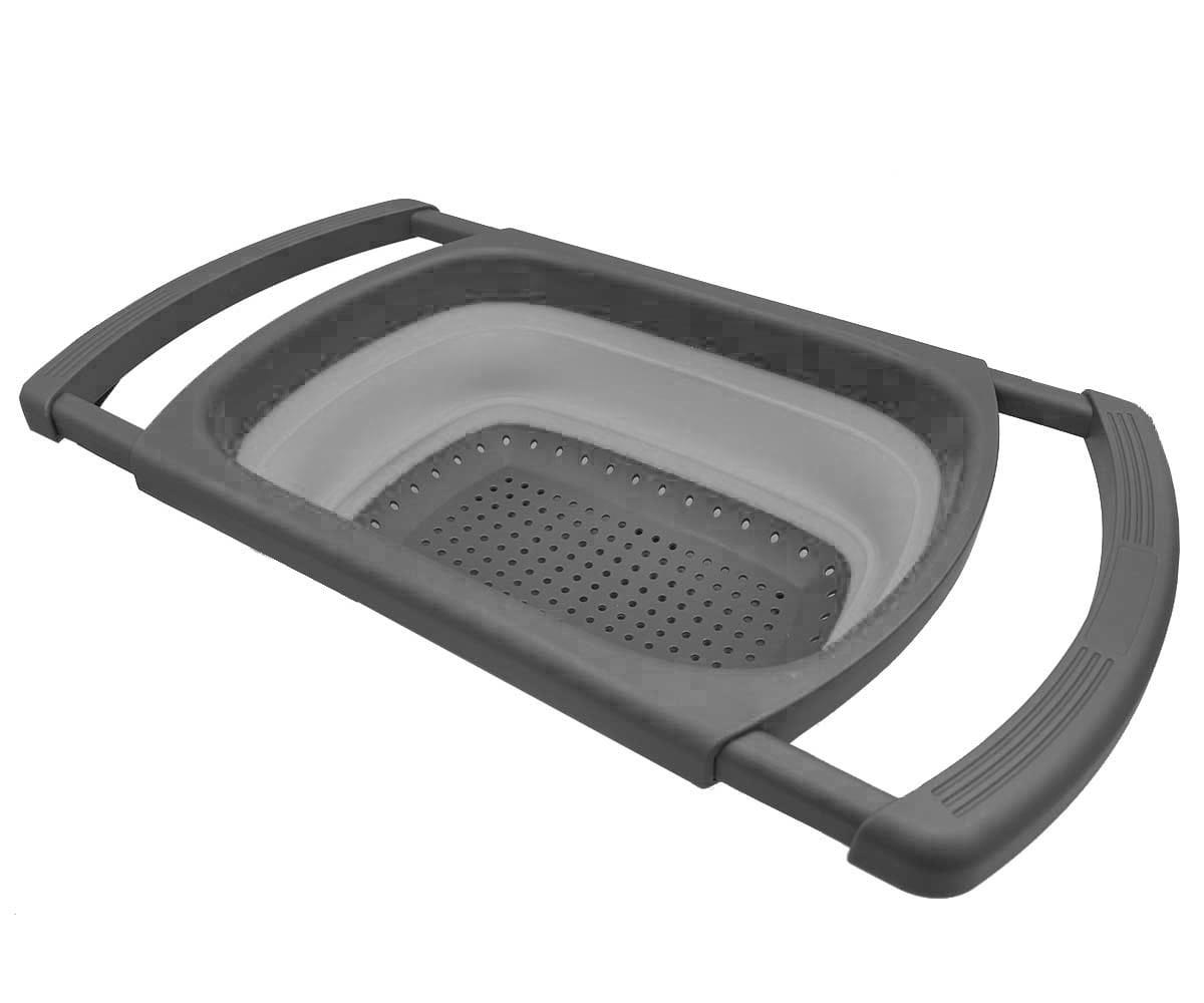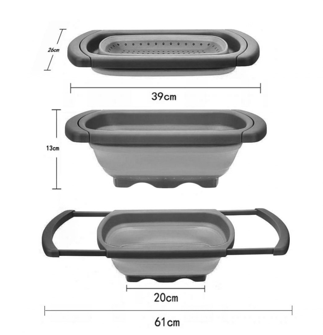 Rozsuwany durszlak silikonowy na zlew. Regulowana szerokość (do 61 cm). Składana misa. Idealny do mycia warzyw. Marka Brunbeste.