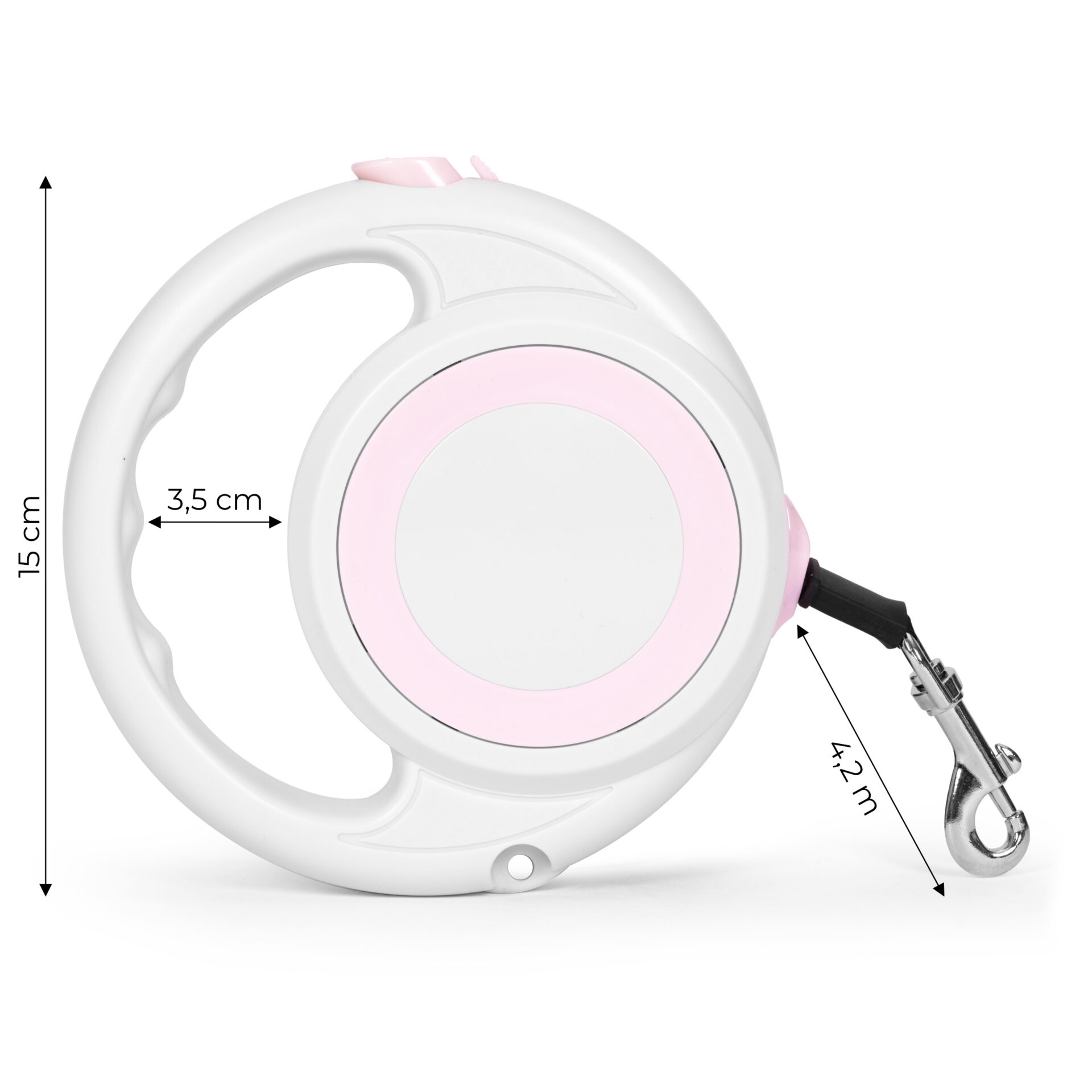 | Specyfikacja | Wymiary uchwytu: 3, 5 cm, Długość smyczy: 4, 2 m, Maksymalna waga zwierzaka: 15kg, Stalowy antykorozyjny karabińczyk obrotowy o 360⁰, Wymiary : 15 cm |