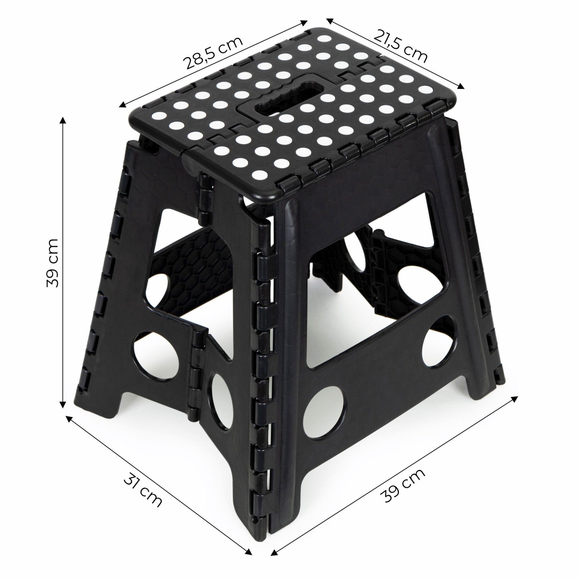 Wysoki stołek składany 39 cm o udźwigu 120 kg. Antypoślizgowy podest i stopki, uchwyt transportowy oraz błyskawiczny system składania w walizkę. Wykonany z trwałego tworzywa. Niezastąpiony w domu.