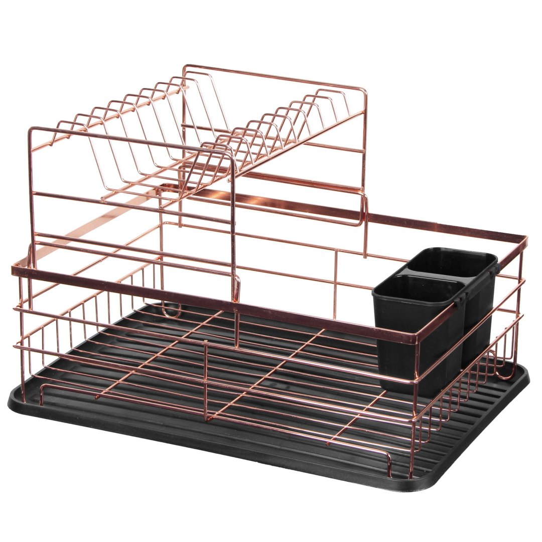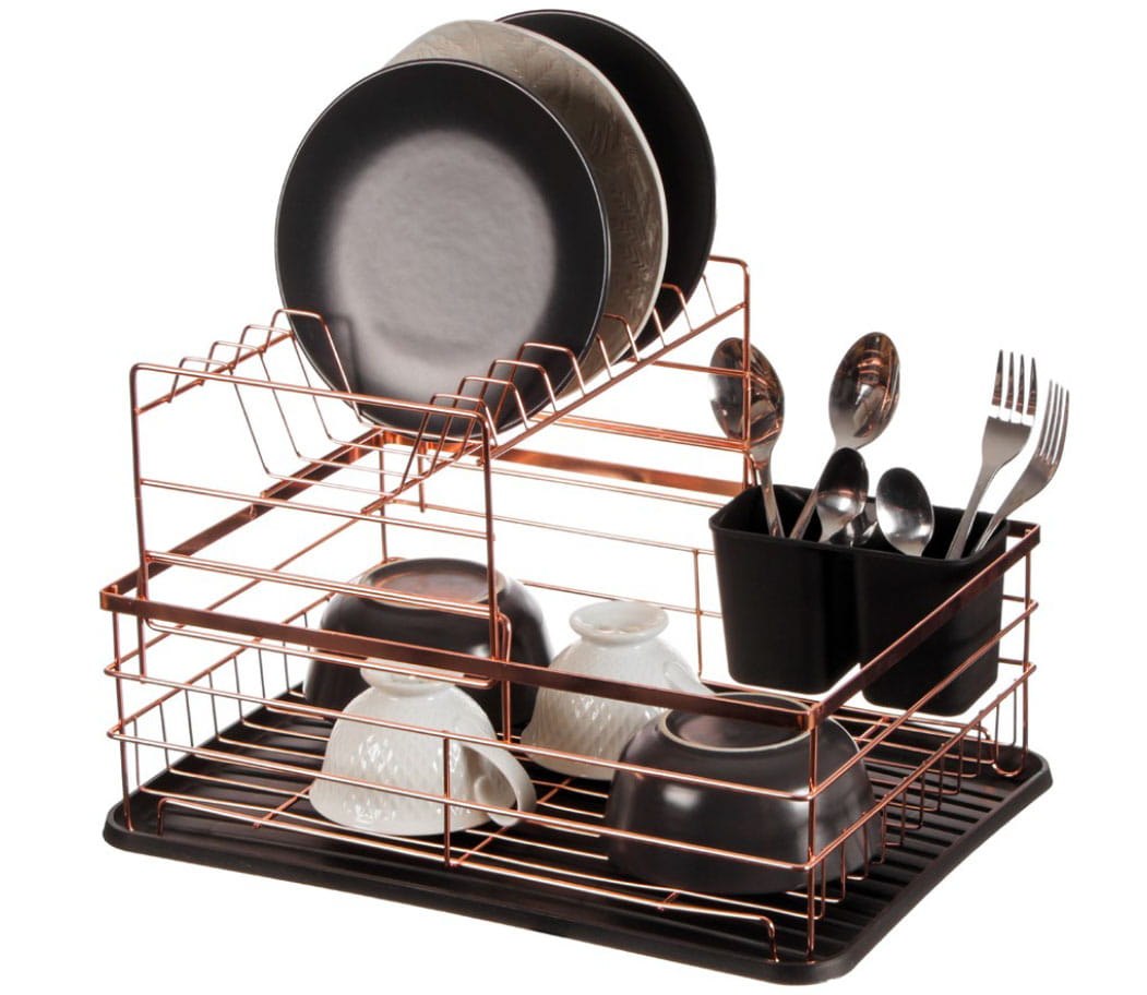 Dwupoziomowa suszarka do naczyń w kolorze różowego złota. Zdejmowana nadstawka. Elegancka i pojemna. Marka Brunbeste.