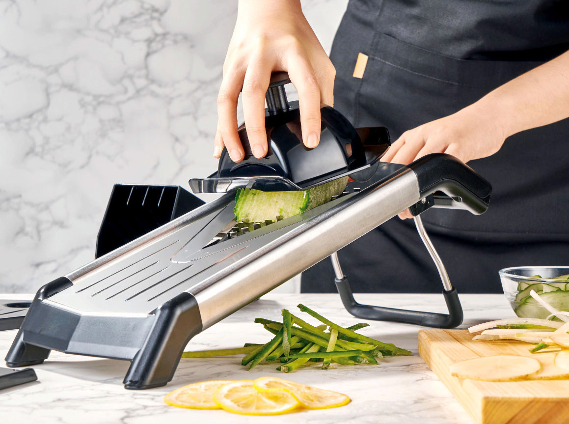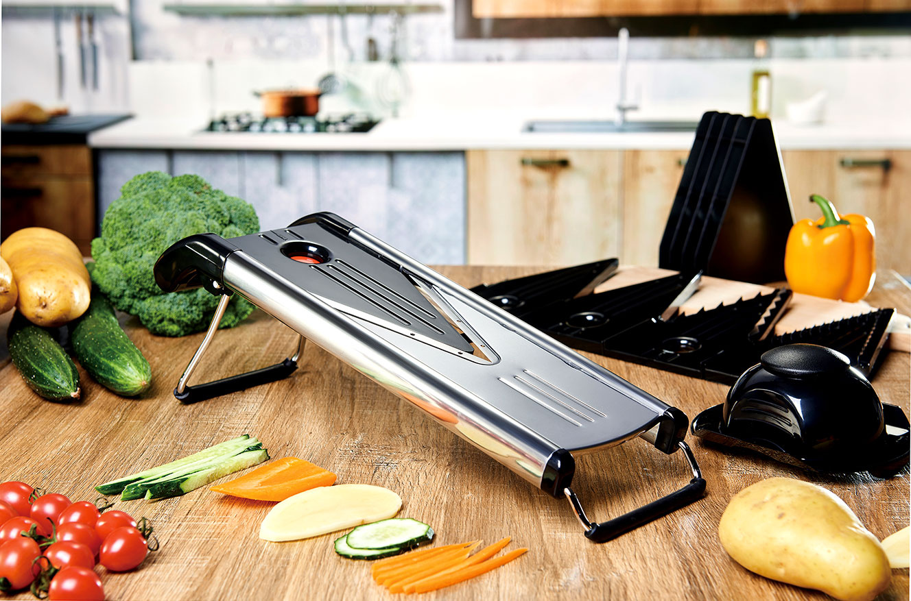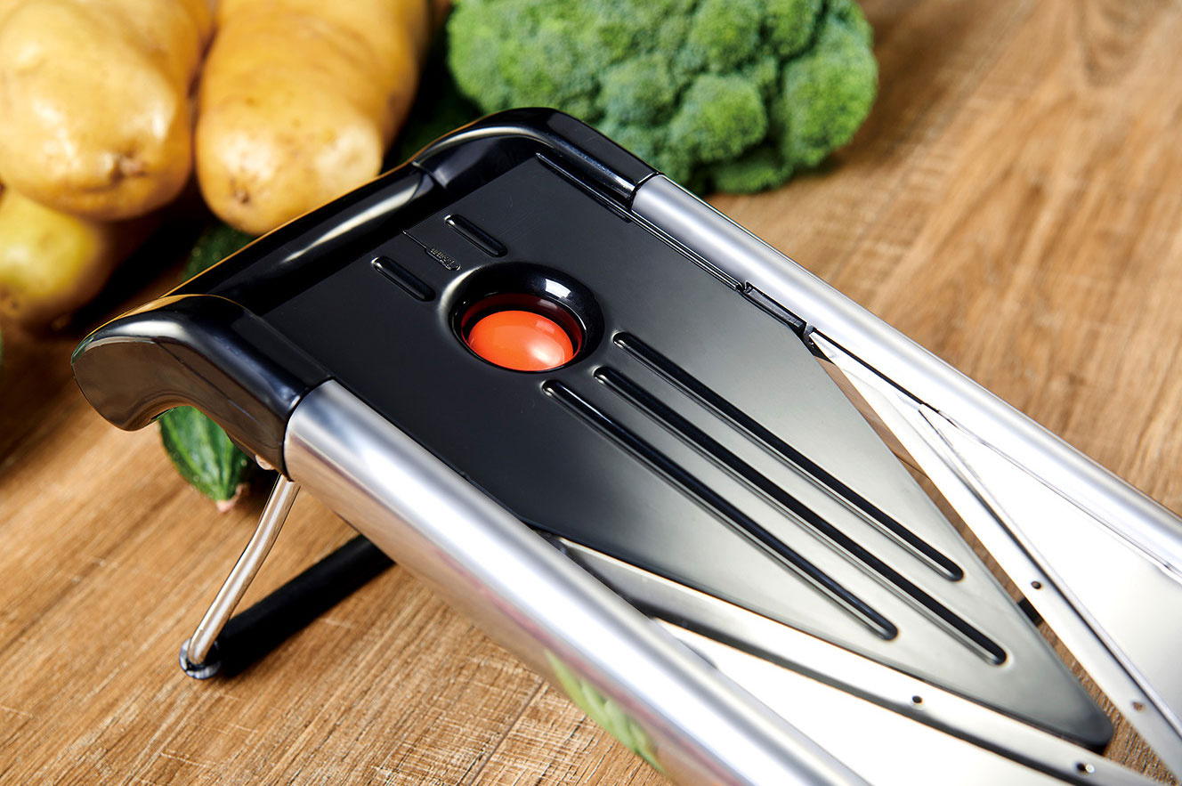 Profesjonalna mandolina z ostrzem V. 5 wymiennych wkładek (plastry, paski). Stabilna i ostra. Idealna do gastronomii. Marka Kinghoff.