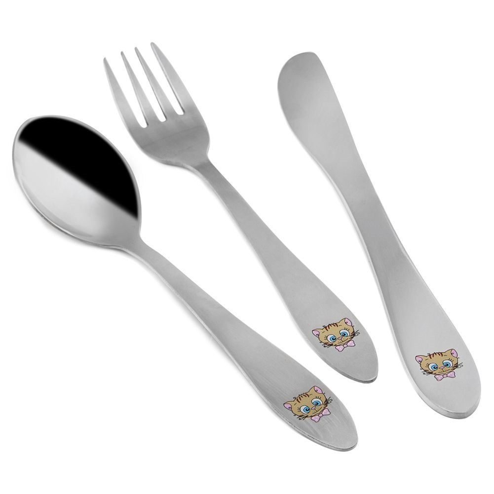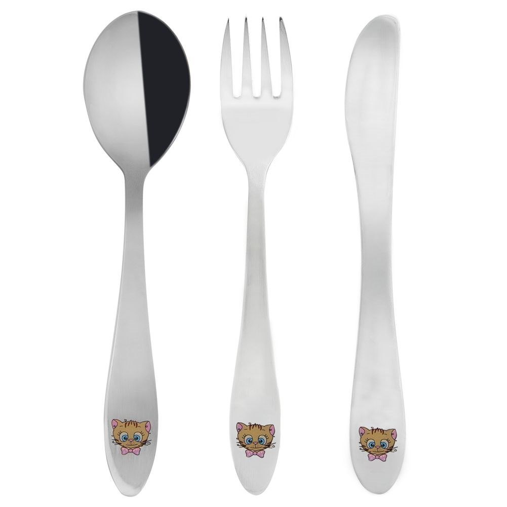 Sztućce dziecięce z motywem kotka. 3 elementy. Stal nierdzewna z kolorowym dekorem. Bezpieczne i lekkie. Marka Orion.