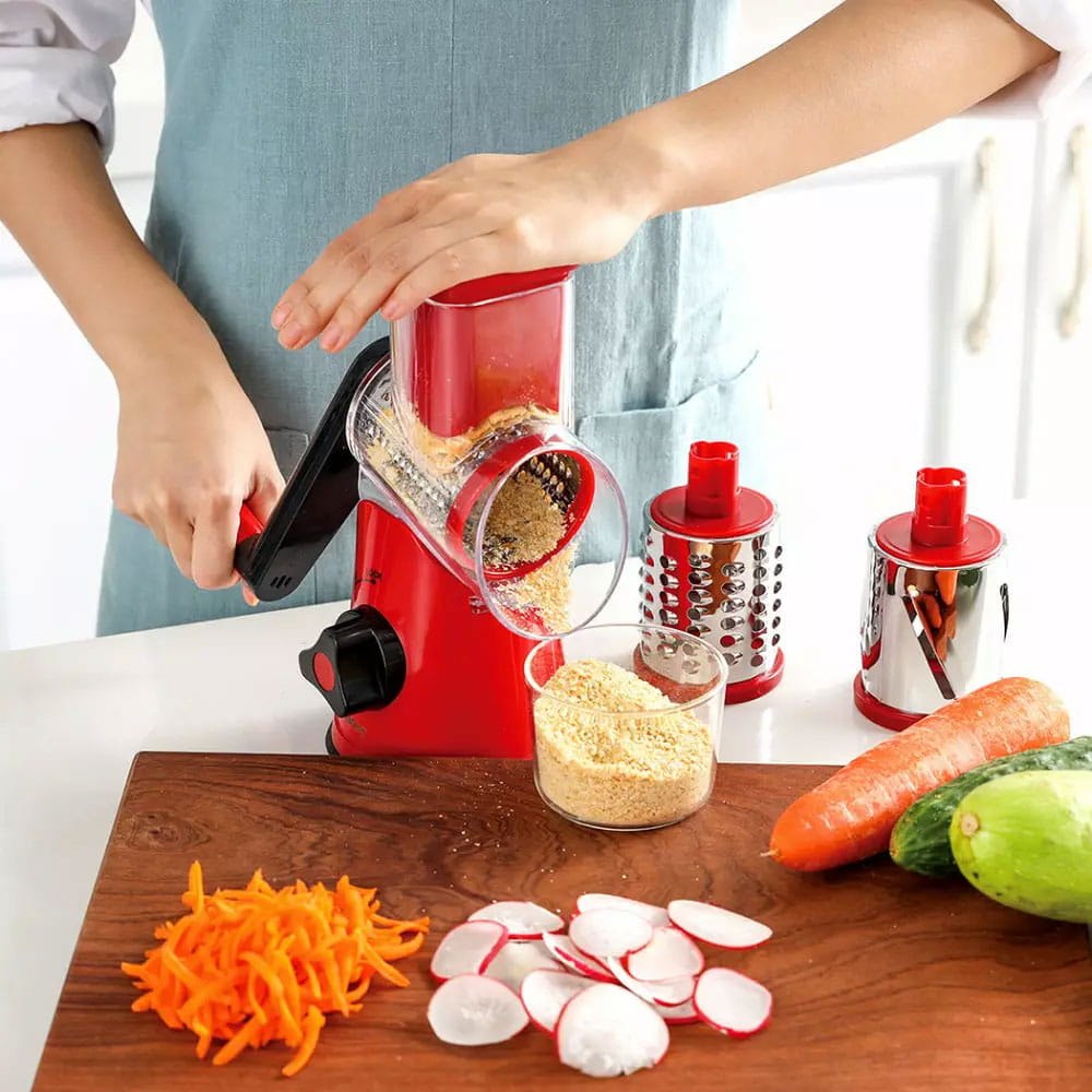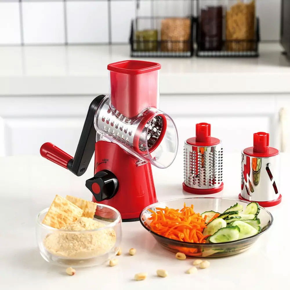 Ręczna tarka bębnowa z korbką i przyssawką. 3 wymienne ostrza (bębny). Szybkie tarcie sera, orzechów i warzyw. Marka Kinghoff.