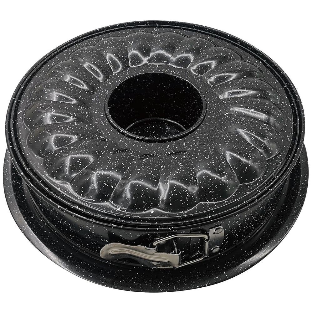Rozpinana tortownica 24 cm z dwoma dnami (płaskie + komin do babki). Powłoka marmurkowa nieprzywierająca. 2 formy w 1. Marka Kinghoff.