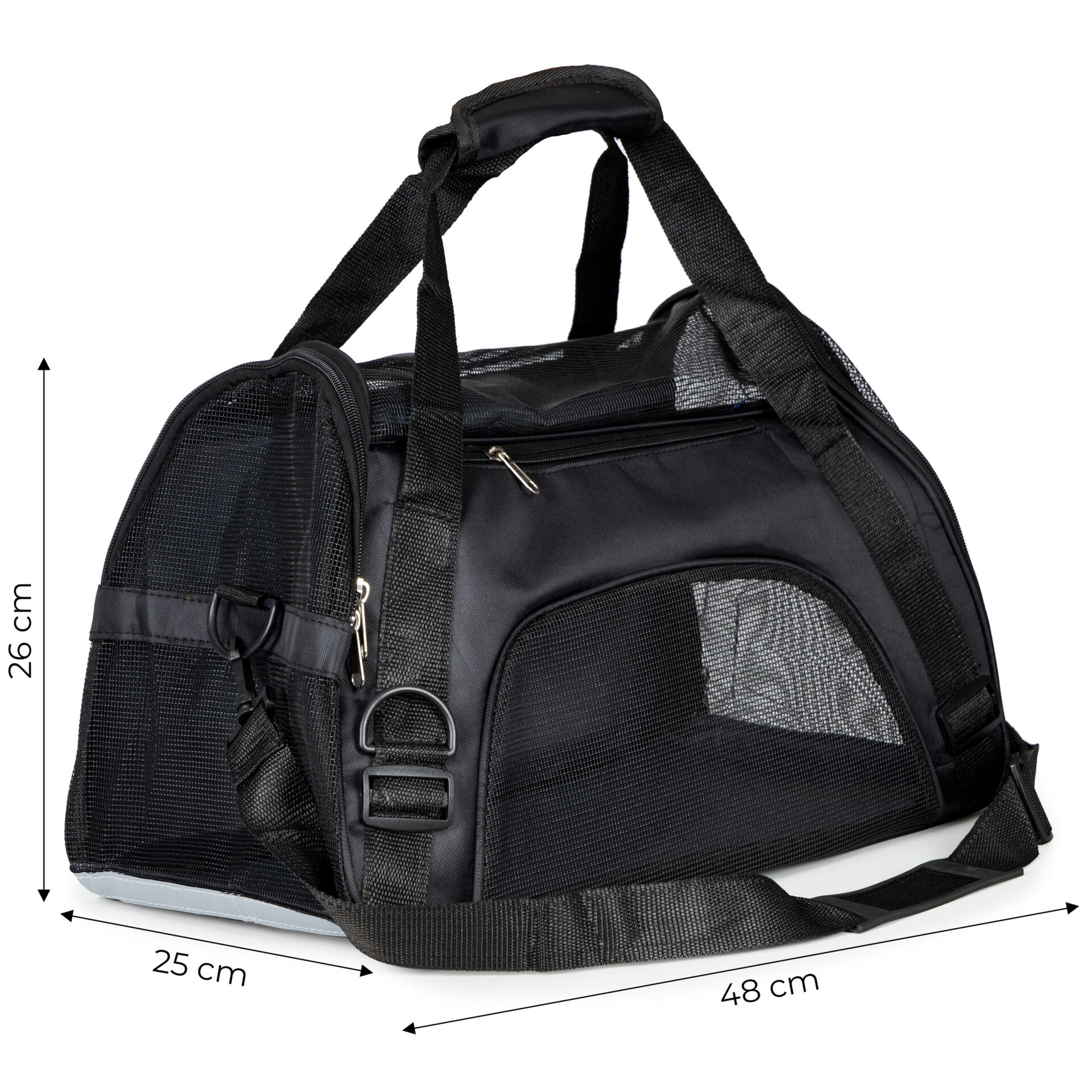 Wygodny transporter torba dla psa i kota. Wyposażony w siatki wentylacyjne, usztywniane dno z matą, kieszeń na akcesoria i pasek na ramię. Otwierany z dwóch stron. Wytrzymały i bezpieczny dla zwierząt.