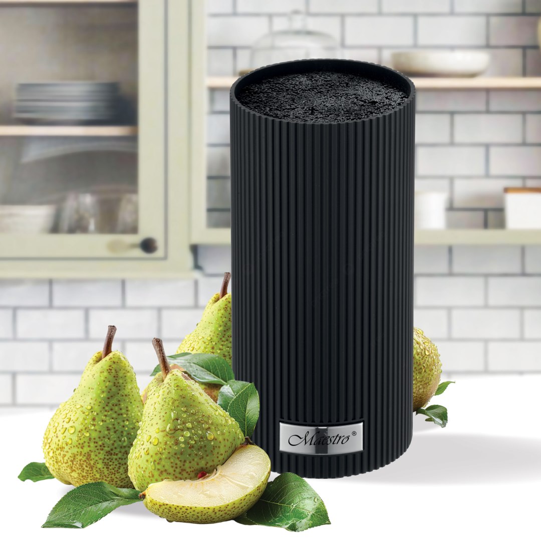 Prostota i elegancja. Stojak na noże Maestro MR-1437-BL to klasyczny, okrągły blok uniwersalny w kolorze czarnym. Jego powierzchnia pokryta jest powłoką soft-touch (satynowa w dotyku), co nadaje mu ekskluzywny wygląd. Wewnątrz znajduje się wkład z pręcików polipropylenowych, który bezpiecznie trzyma noże o dowolnym kształcie. Kompaktowy rozmiar (18×11 cm) sprawia, że pasuje nawet do małych kuchni.