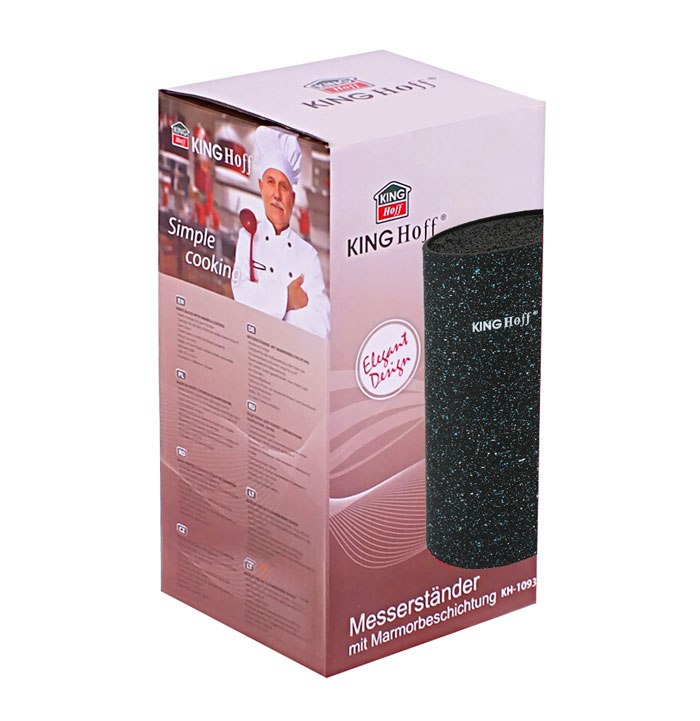 Ożyw swoją kuchnię. Uniwersalny stojak na noże Kinghoff KH-1091 wyróżnia się oryginalnym wykończeniem: czarne tło nakrapiane białymi i błękitnymi plamkami (wzór „kosmos” lub lastryko). Powłoka silikonowa jest miękka w dotyku. Wewnątrz znajduje się standardowy wkład pręcikowy, który mieści do 8 noży. To funkcjonalny gadżet, który przyciąga wzrok.