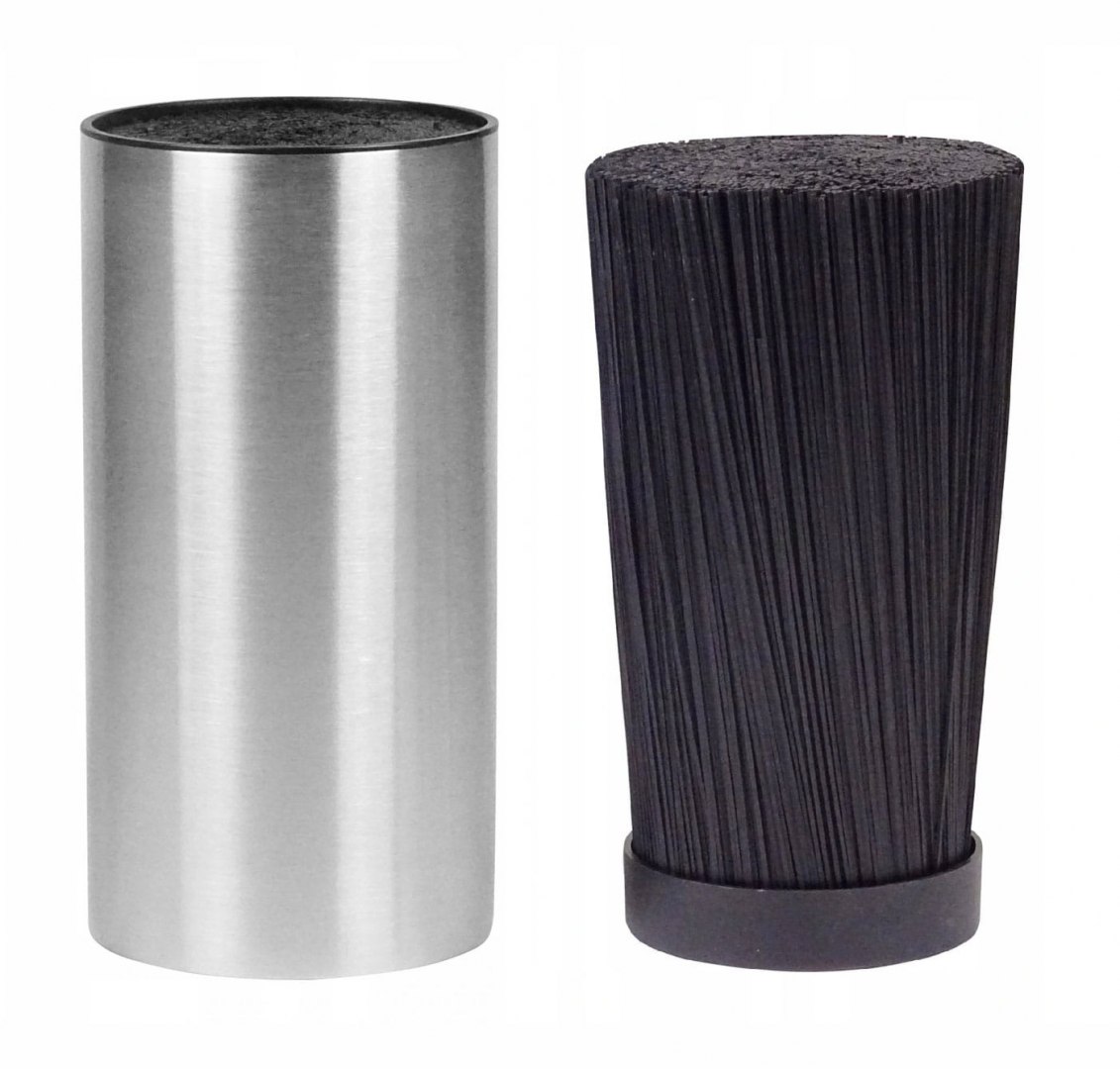 Pojemny i stabilny. Stojak Brunbeste BB-1771 o szerokości 11 cm to większa wersja uniwersalnego bloku z wkładem pręcikowym. Pomieści więcej noży, w tym szerokie tasaki czy noże szefa kuchni. Satynowe, srebrne wykończenie pasuje do sprzętów AGD ze stali nierdzewnej. Wkład z nitek polipropylenowych chroni ostrza przed stępieniem i pozwala na dowolne układanie noży.
