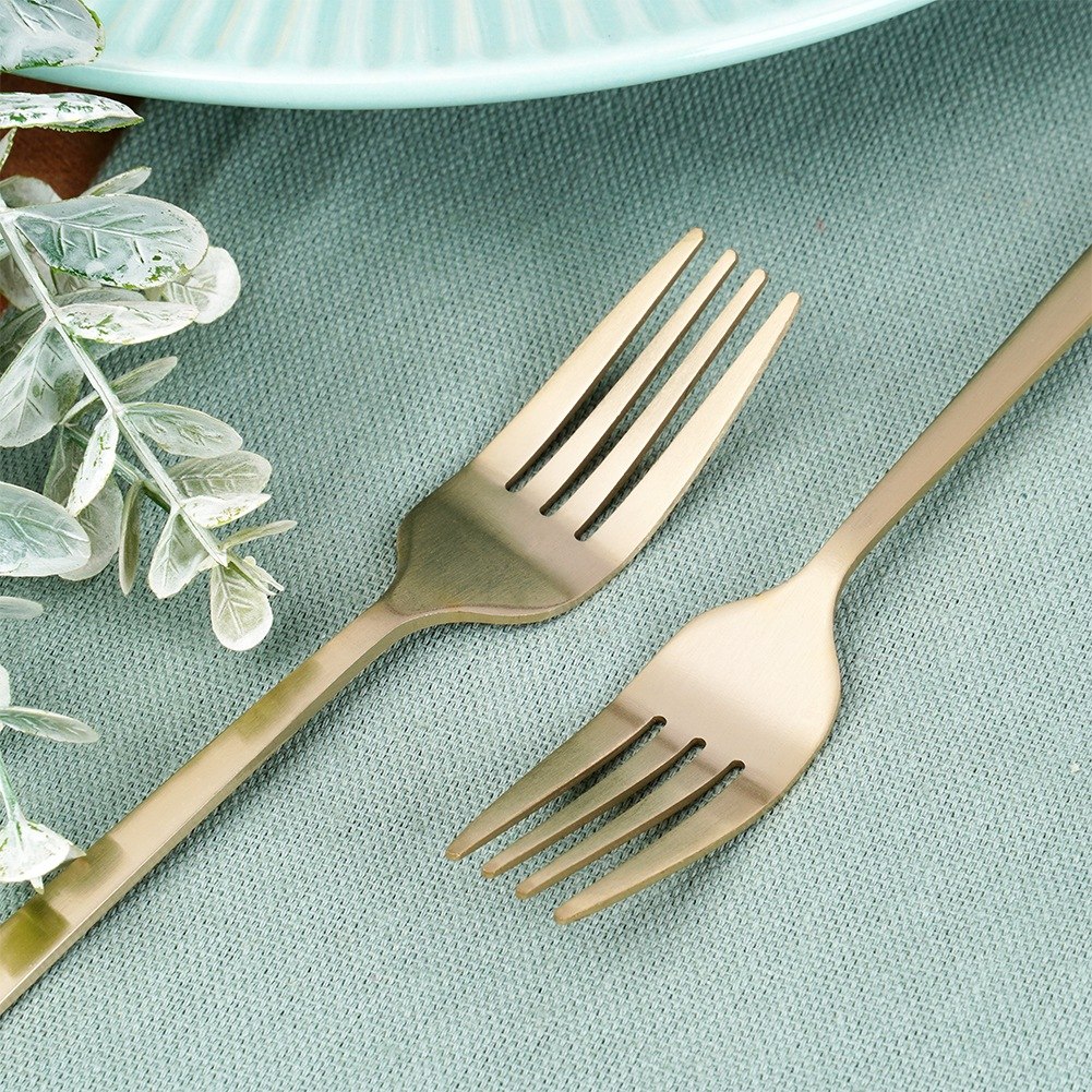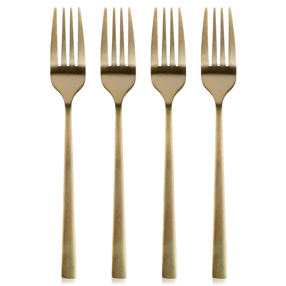 Złoto na talerzu. Komplet 4 widelczyków deserowych Excellent Houseware w kolorze złotym (satyna) doda blasku każdemu przyjęciu. Wykonane ze stali nierdzewnej, są eleganckie i trwałe. Świetnie komponują się z klasyczną porcelaną oraz modnymi talerzami w ciemnych kolorach. Mimo delikatnego wyglądu, są solidne i nadają się do mycia w zmywarce.