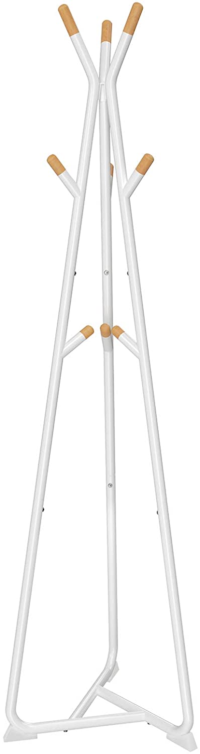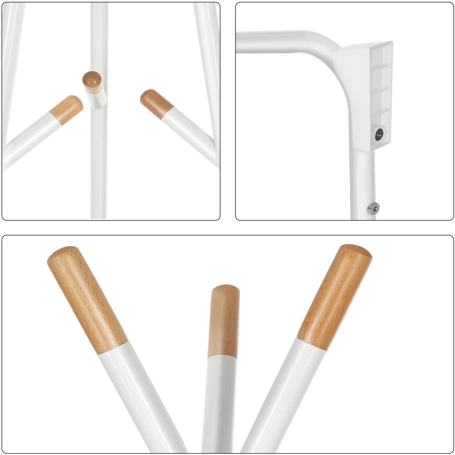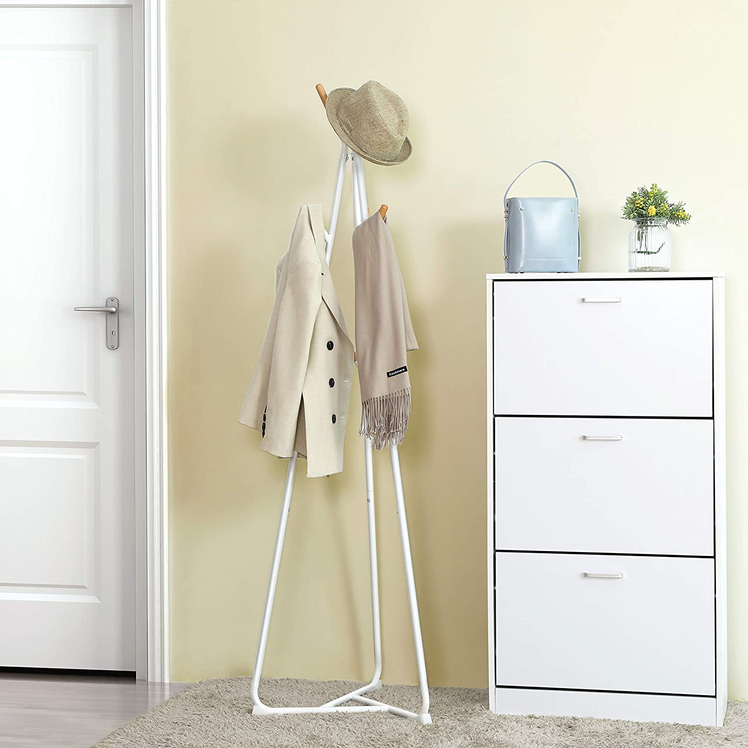 Stylowy wieszak stojący biały z drewnianymi hakami. Stabilna trójkątna podstawa, 9 uchwytów. Idealny do stylu skandynawskiego. Udźwig haka 5 kg.