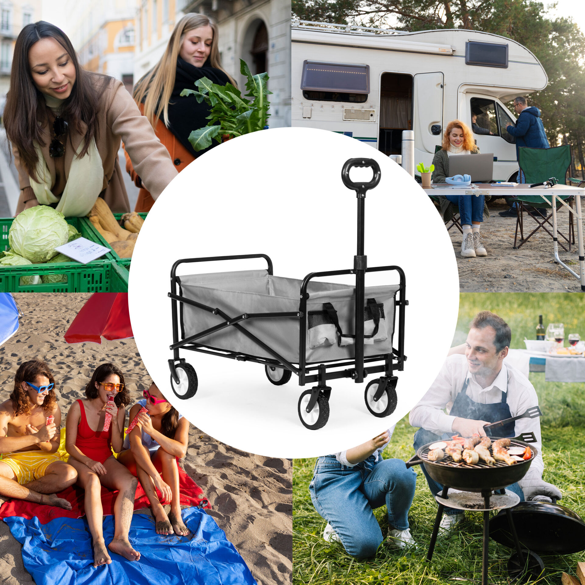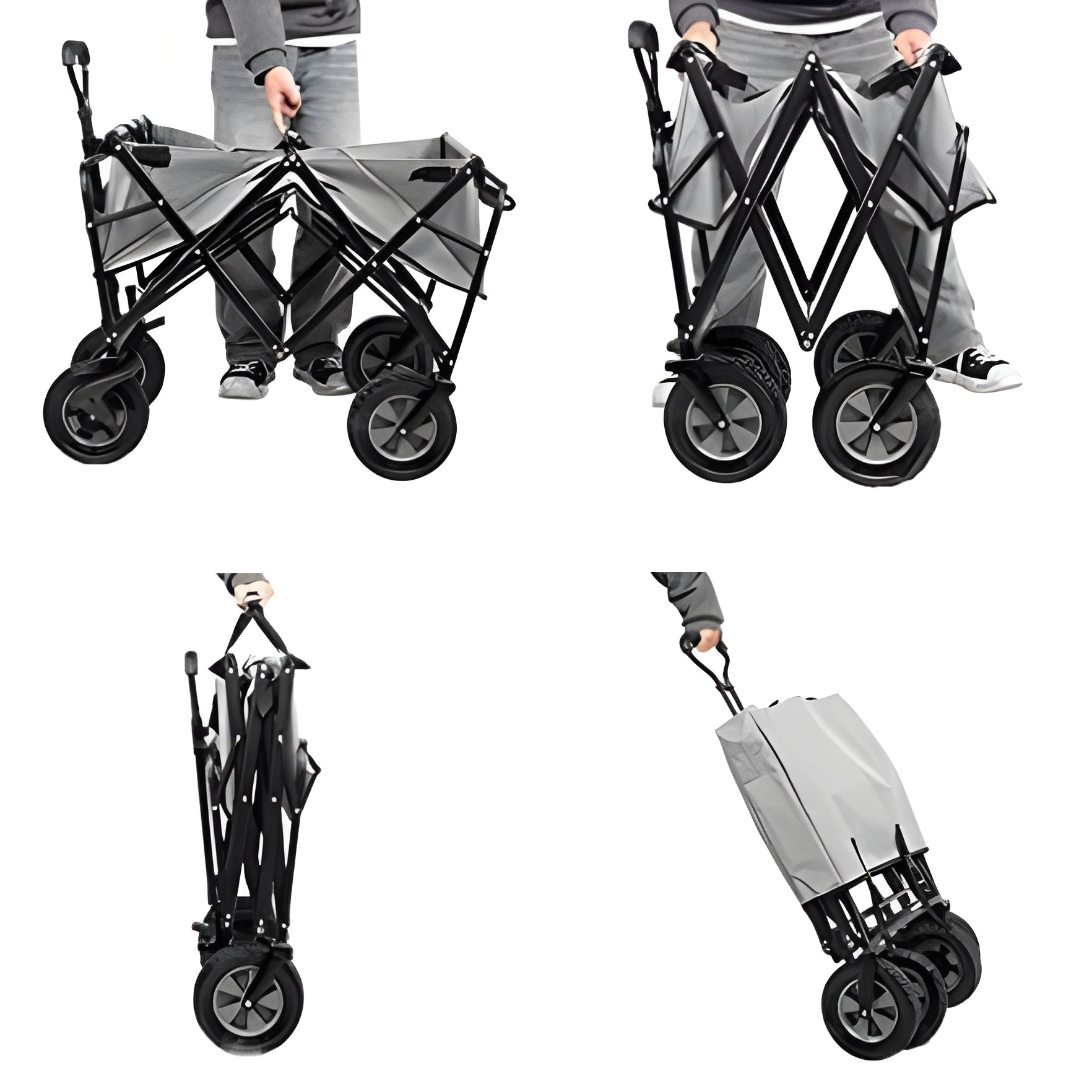 Duży składany wózek transportowy do 100 kg. Wykonany z wodoodpornego materiału Oxford w kolorze szarym. Posiada skrętne koła z gumowym bieżnikiem, stalowy stelaż i kieszonki na napoje. Idealny do ogrodu i na plażę.
