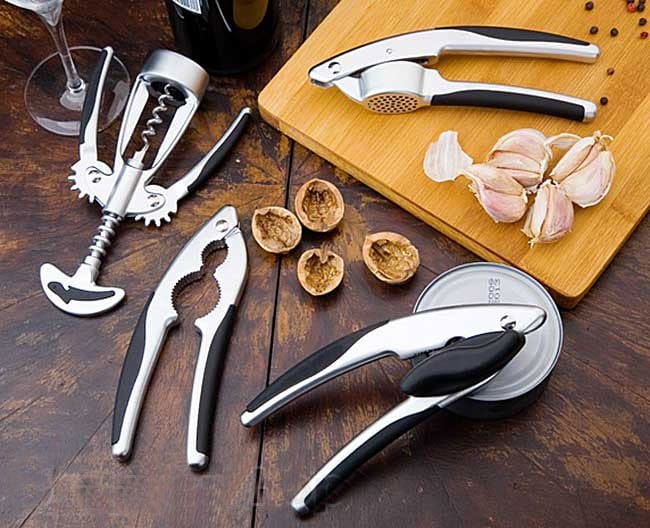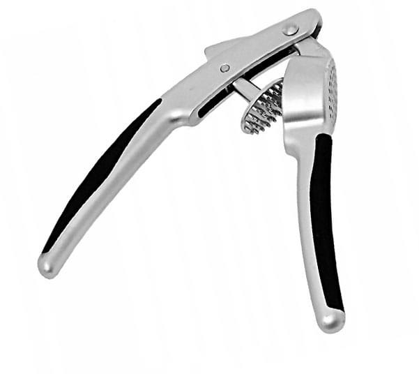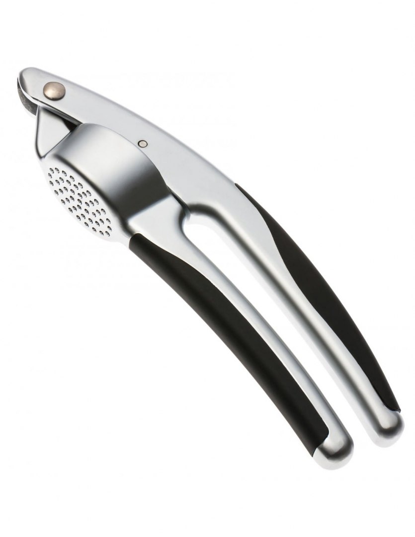 Stalowy wyciskacz do czosnku z silikonowymi uchwytami. Wykończenie satynowe. Wygodny i solidny. Marka Kinghoff.