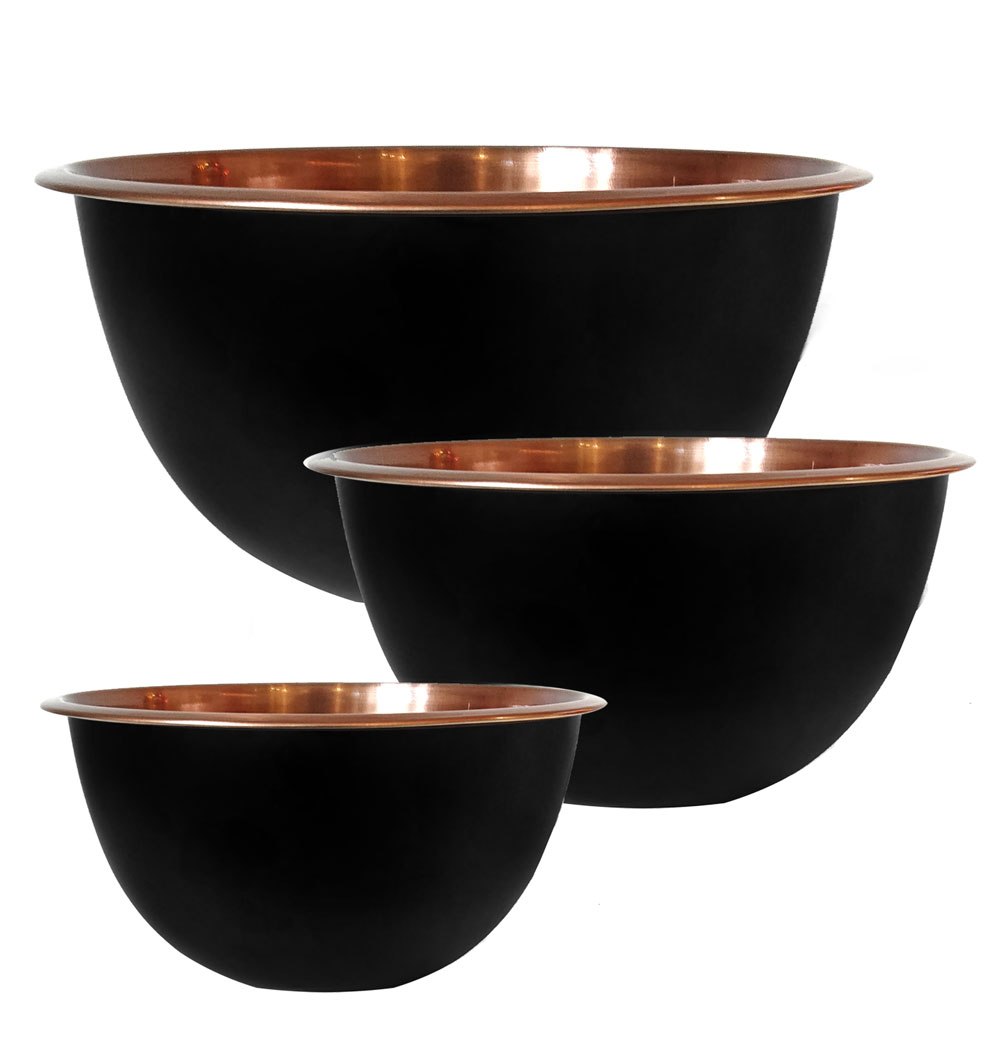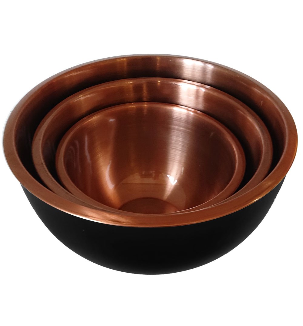 Zestaw 3 misek ze stali nierdzewnej (1.6L, 3L, 5L). Czarny mat zewnątrz, miedziany środek. Rant zapobiegający kapaniu.