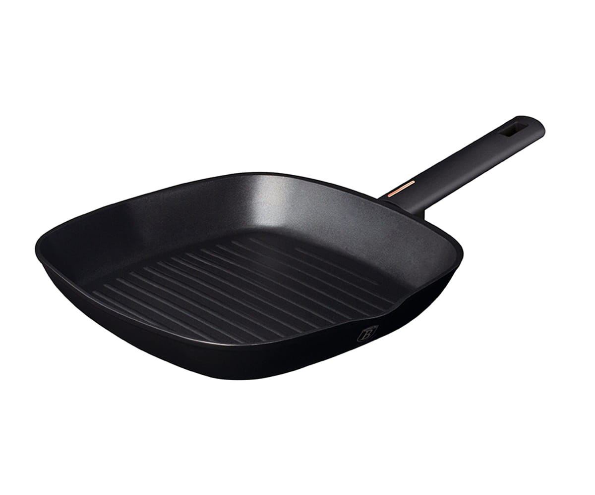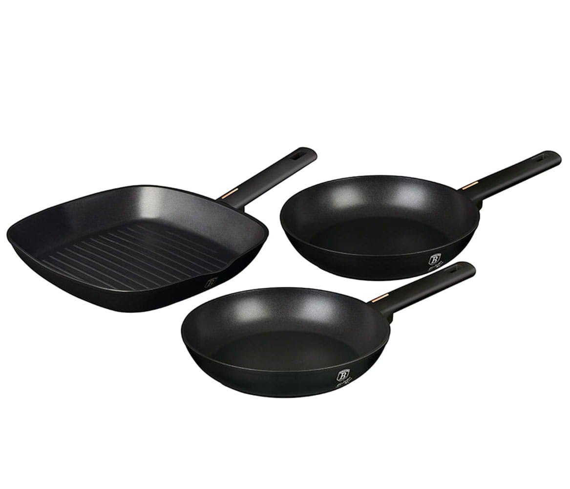 Zestaw 3 patelni tytanowych (w tym grillowa). Czarny mat z uchwytami Rose Gold. Najwyższa odporność na zarysowania.