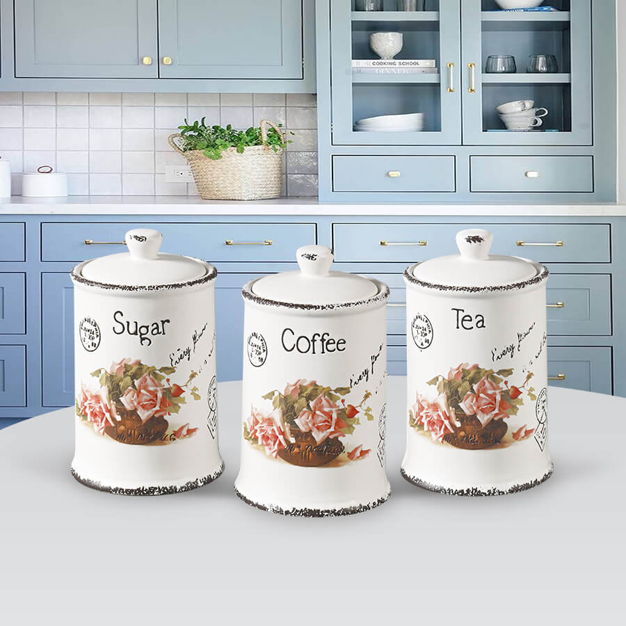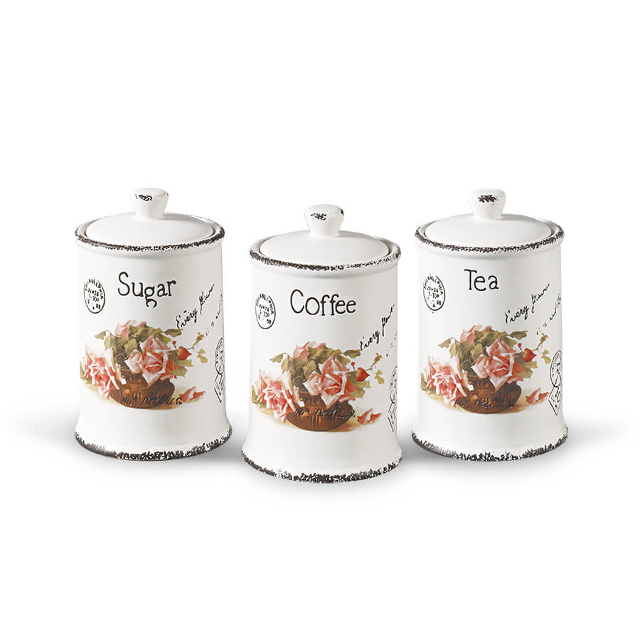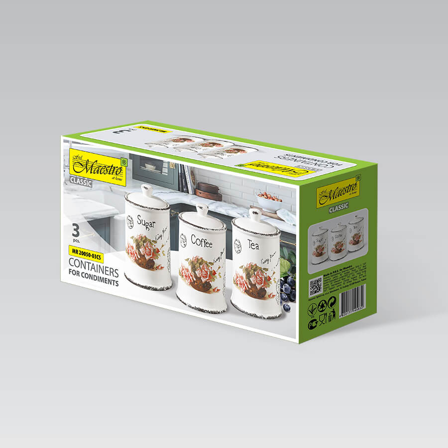Organizacja kuchni w dobrym stylu. Zestaw Maestro MR-20050-03CS to trzy pojemniki dedykowane do przechowywania podstawowych produktów: kawy, herbaty i cukru. Wykonane z solidnej ceramiki, są trwałe i łatwe w utrzymaniu czystości.